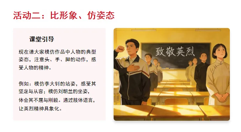 仿姿态:带领学生模仿作品中人物的典型姿态(如刘胡兰的站立姿态),提示“注意头、手、脚的动作,感受人物的精神”。