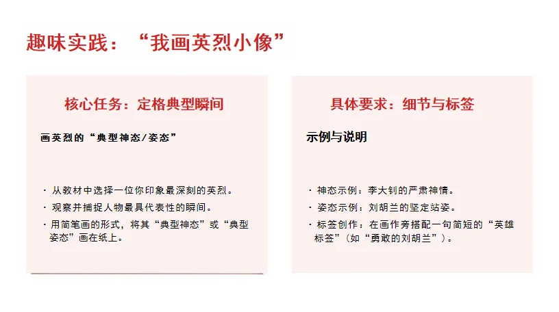 内容维度:围绕“英烈艺术作品”展开,引导学生观察作品中的人物形象、神态,结合故事理解英烈的精神品质;