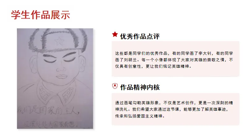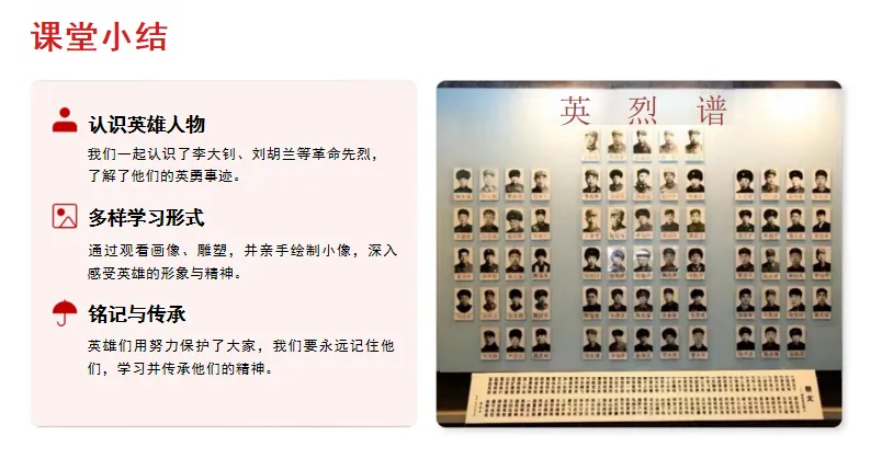 3.教师总结:"这些画和雕塑,都是为了让我们记住这些英雄——他们的精神值得我们学习!”