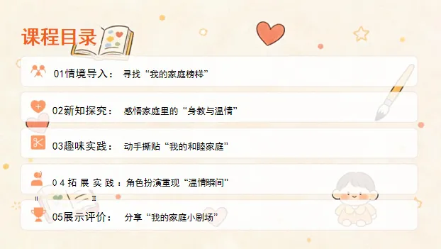 内容维度:以“家风与家庭温情”为核心,通过“介绍家庭、撕贴画表现和睦家庭、角色扮演展示温情瞬间”等活动,引导学生感知家 庭中的榜样力量(父母的身教),理解“好家风”的内涵;