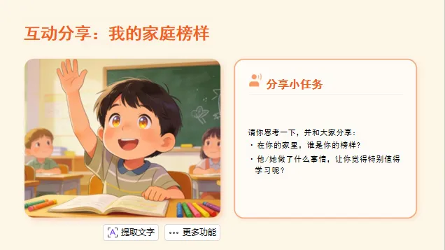 2.互动分享:请学生说说“家里谁是你的榜样?他/她做了什么让你学习?”(如“妈妈总帮我整理书包,我也学会了整理书桌”);
