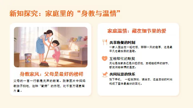 (二)新知探究:家庭里的“身教与温情”(8分钟)结合教材内容,引导感知: