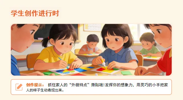 形式维度:以“趣味实践”为线索,用撕贴、角色扮演等低年级学生易参与的形式,将美术创作与家庭情感表达结合;