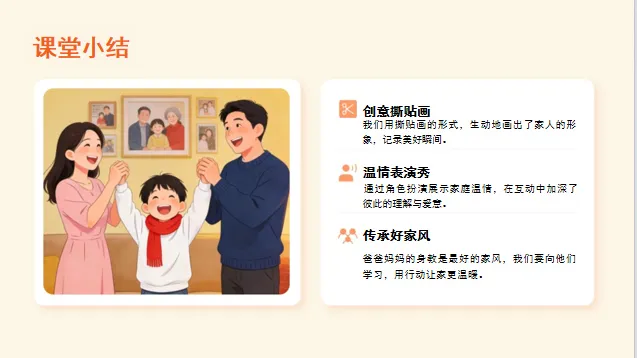 今天我们用撕贴画画出了家人,还用表演展示了家庭温情。爸爸妈妈的身教是最好的家风,我们要向他们学习,让家里更温暖!