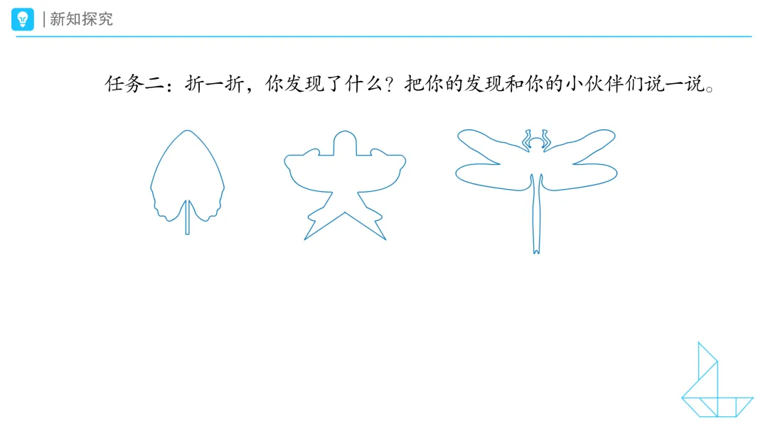 预设1:我发现,把叶子的图形像这样从右边翻折到左边,两边会重合。但是,把叶子的下面翻折到上面,却不会重合。