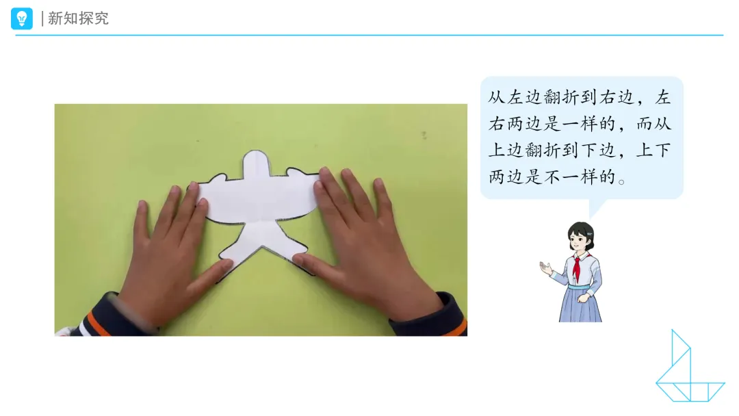 预设2:我也是这样折的。我把燕子风筝的图形像这样从右边翻折到左边,左右两边是一样的,而从上面翻折到下面,上下两面是不一样的。
