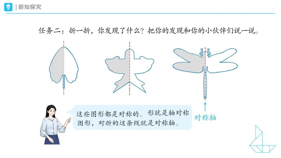 小结:它们沿着一条线对折,图形两边能完全重合。像这样,对折后能完全重合的图形就是轴对称图形,对折的这条线就是对称轴。