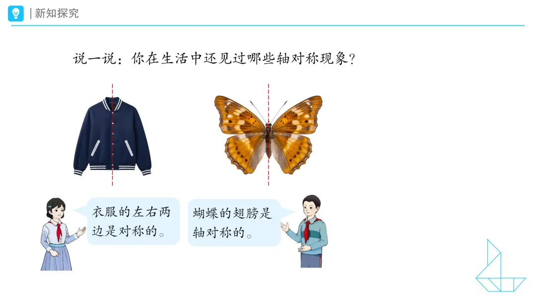 1.在观察、操作、比较等活动中,感知现实生活中的轴对称现象,直观认识对称轴,体会轴对称图形“对折后能完全重合”的含义,能辨认轴对称图形,发展空间观念和初步的几何直观。
