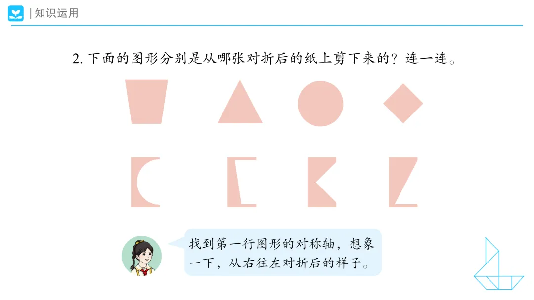 2下面的图形分别是从哪张对折后的纸上剪下来的?连一连。