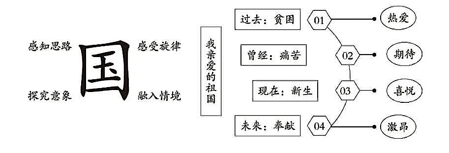 基于“这一篇”的教学路径《祖国啊,我亲爱的祖国》全诗立意新颖,选择以“我”的角度来吟唱祖国母亲,运用了主体与客体交错换用、相互交融的手法。主体为诗人,客体是祖国,而在全诗的进展中,让其合二为一——“我”是祖国的一部分,祖国就是“我”赖以生存与生长的依靠。祖国是“我”的痛苦、“我”的悲哀,祖国也是“我”的希望、“我”的荣光——“我”与祖国一起奔跑,祖国蒸蒸日上,繁荣富强。