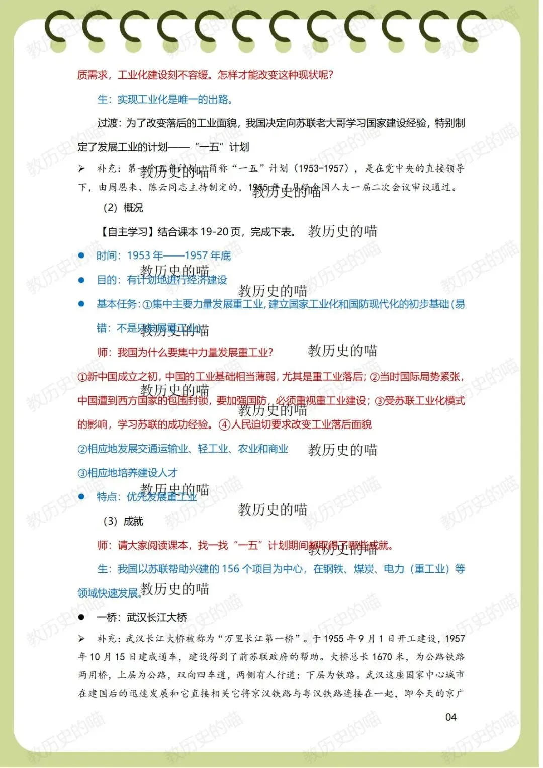 整节课围绕「经济建设 + 政治建设」双线展开✅ 过渡时期总路线 + 一五计划,用数据、史料、情景讲透工业化起步,无缝钢管、武汉长江大桥这些考点全落实✅ 三大改造用「刘老汉的喜与忧」情景贯穿,农业 / 手工业 / 资本主义工商业改造的方式、特点一目了然,赎买政策 + 公私合营的关系讲得明明白白✅ 社会主义政治制度确立,区分根本 / 基本政治制度,避开基层群众自治制度的时间线误区✅ 课堂小结、板书设计、教学反思、分层作业全配套,逻辑闭环超省心