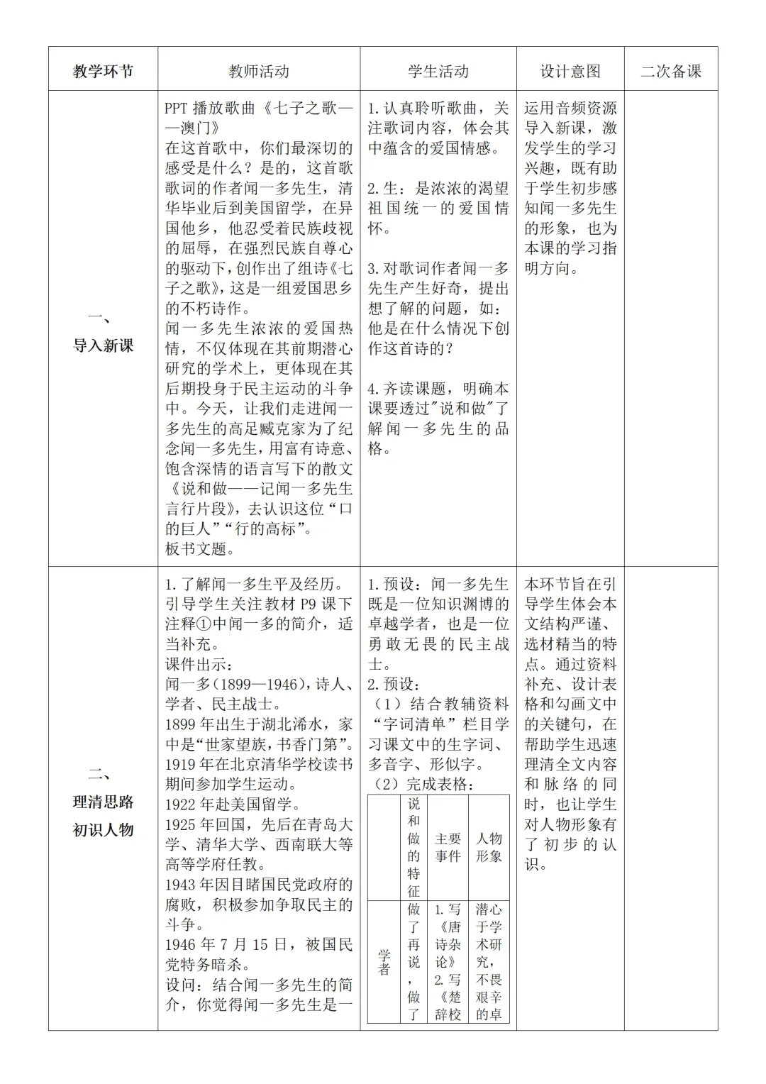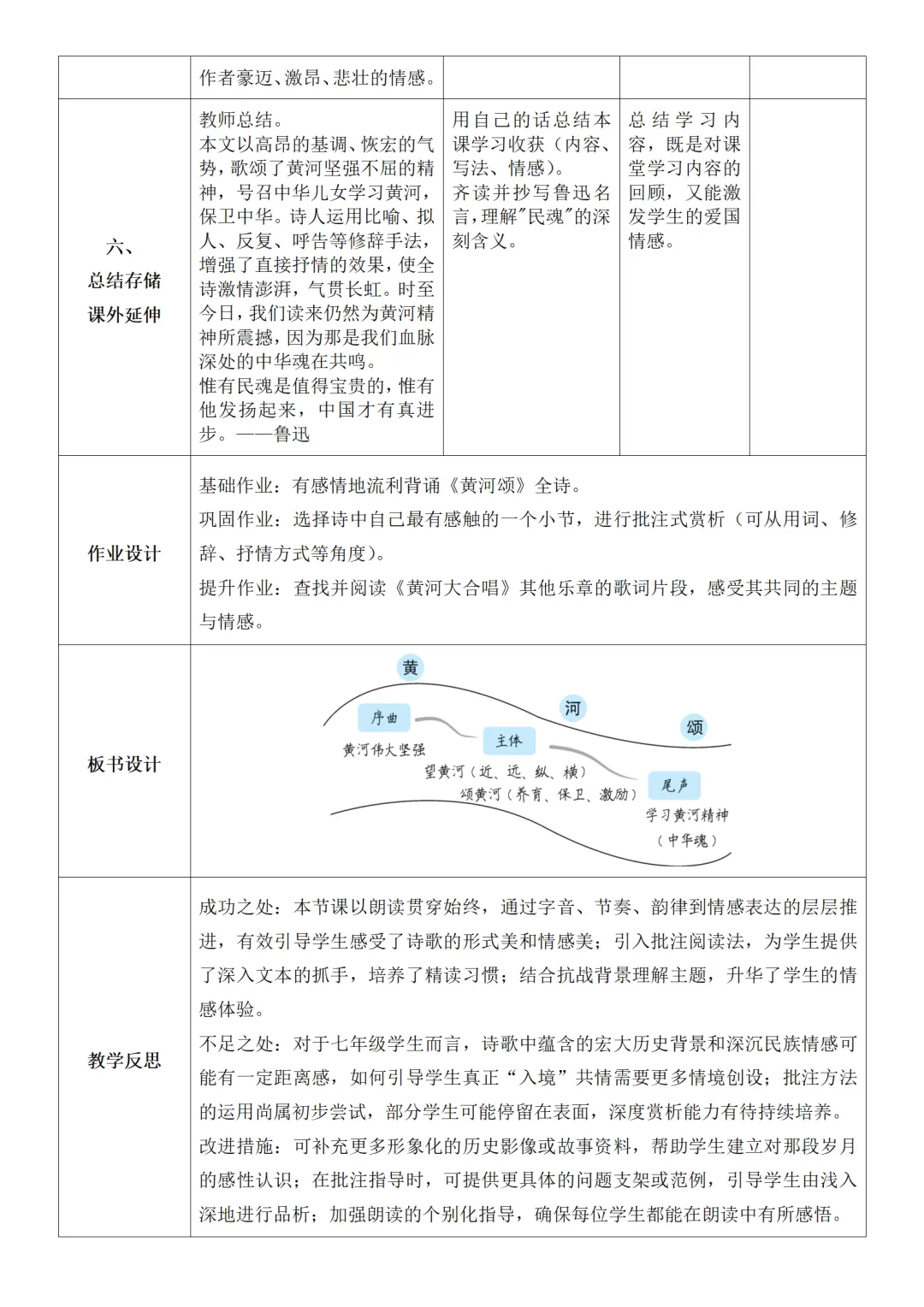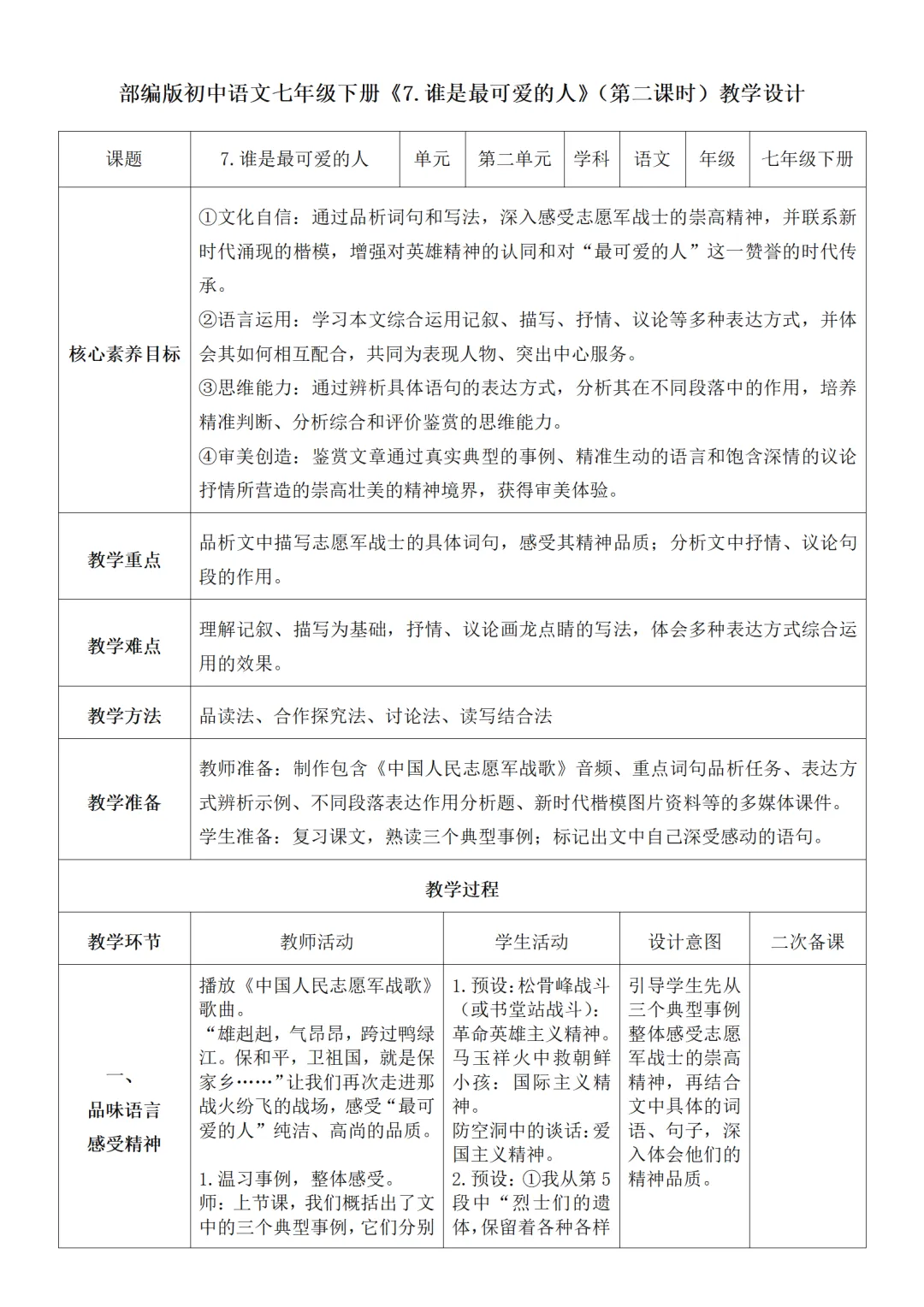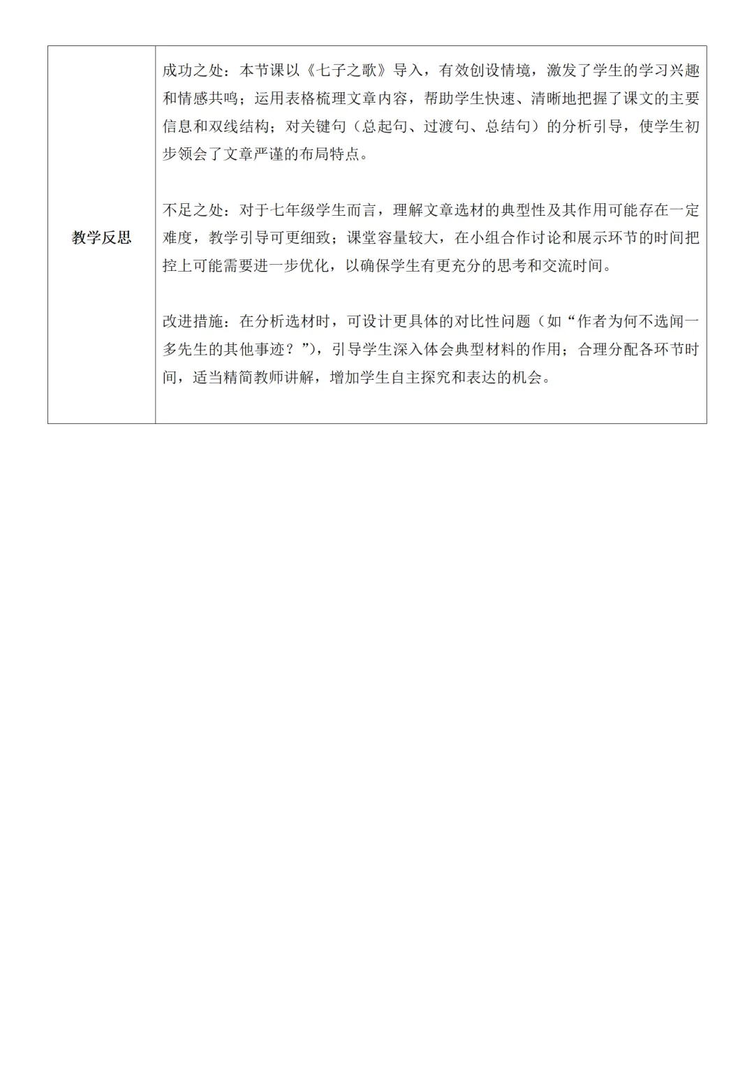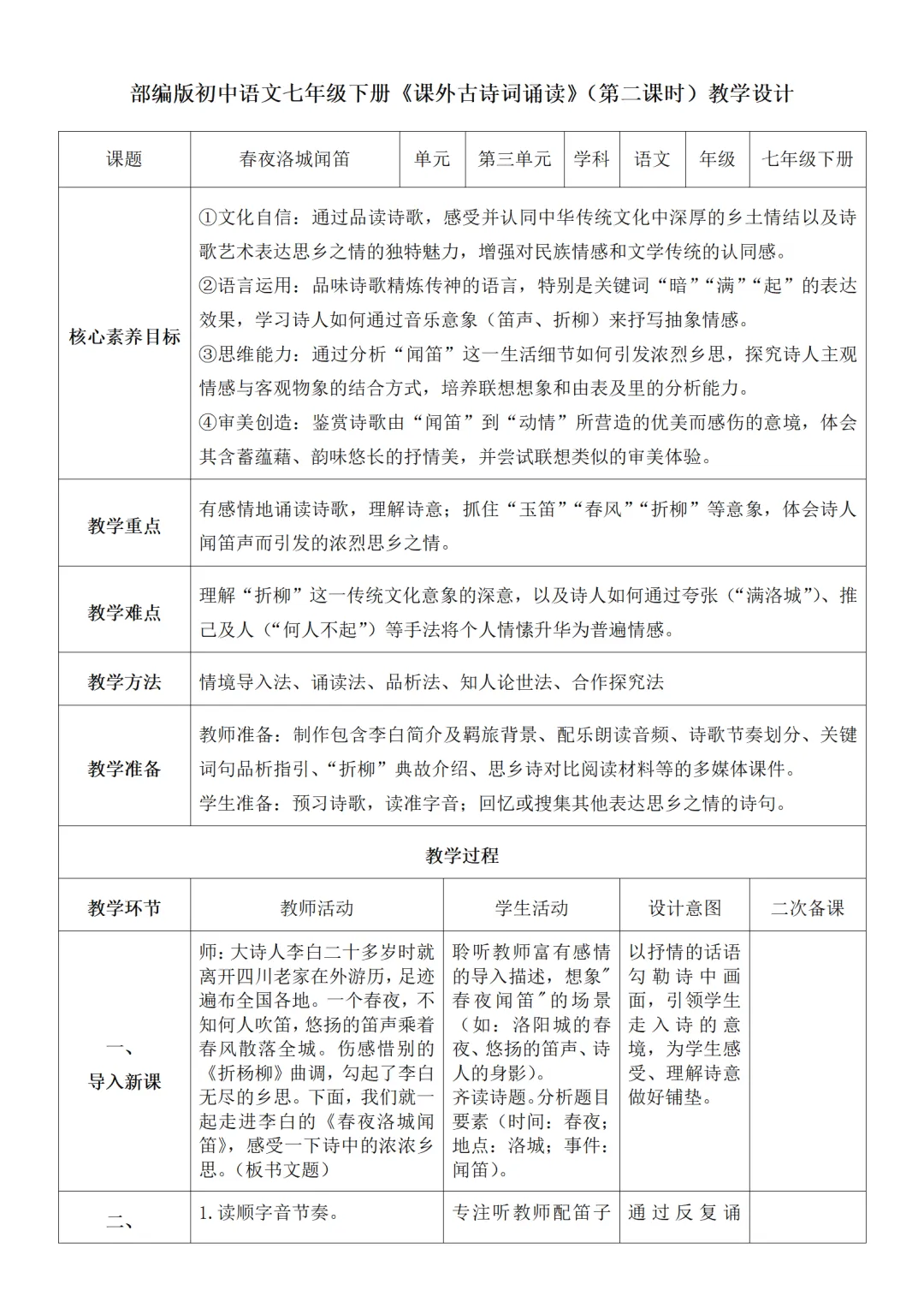 >部编人教版新教材七下语文表格式教案(教学反思有内容)