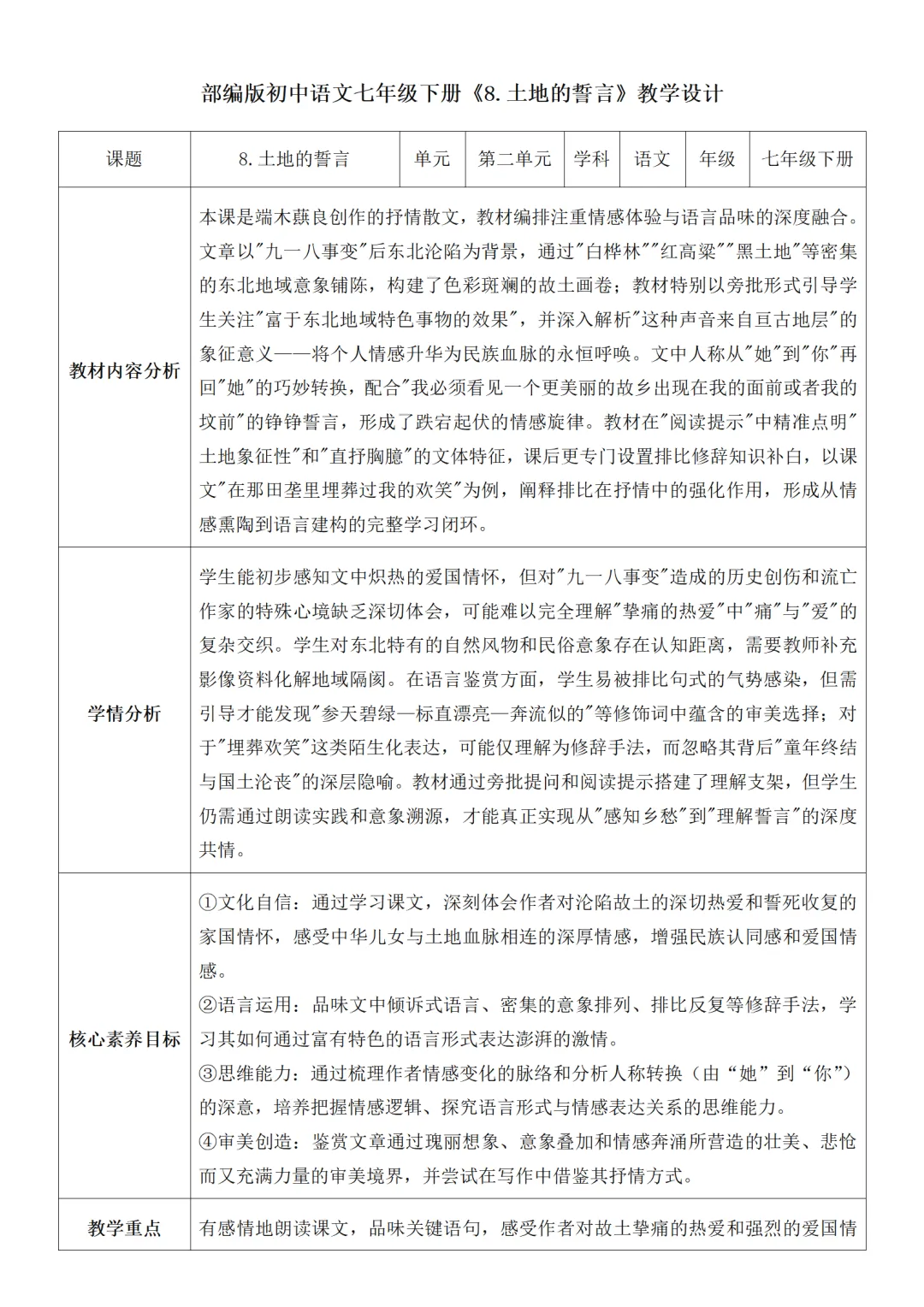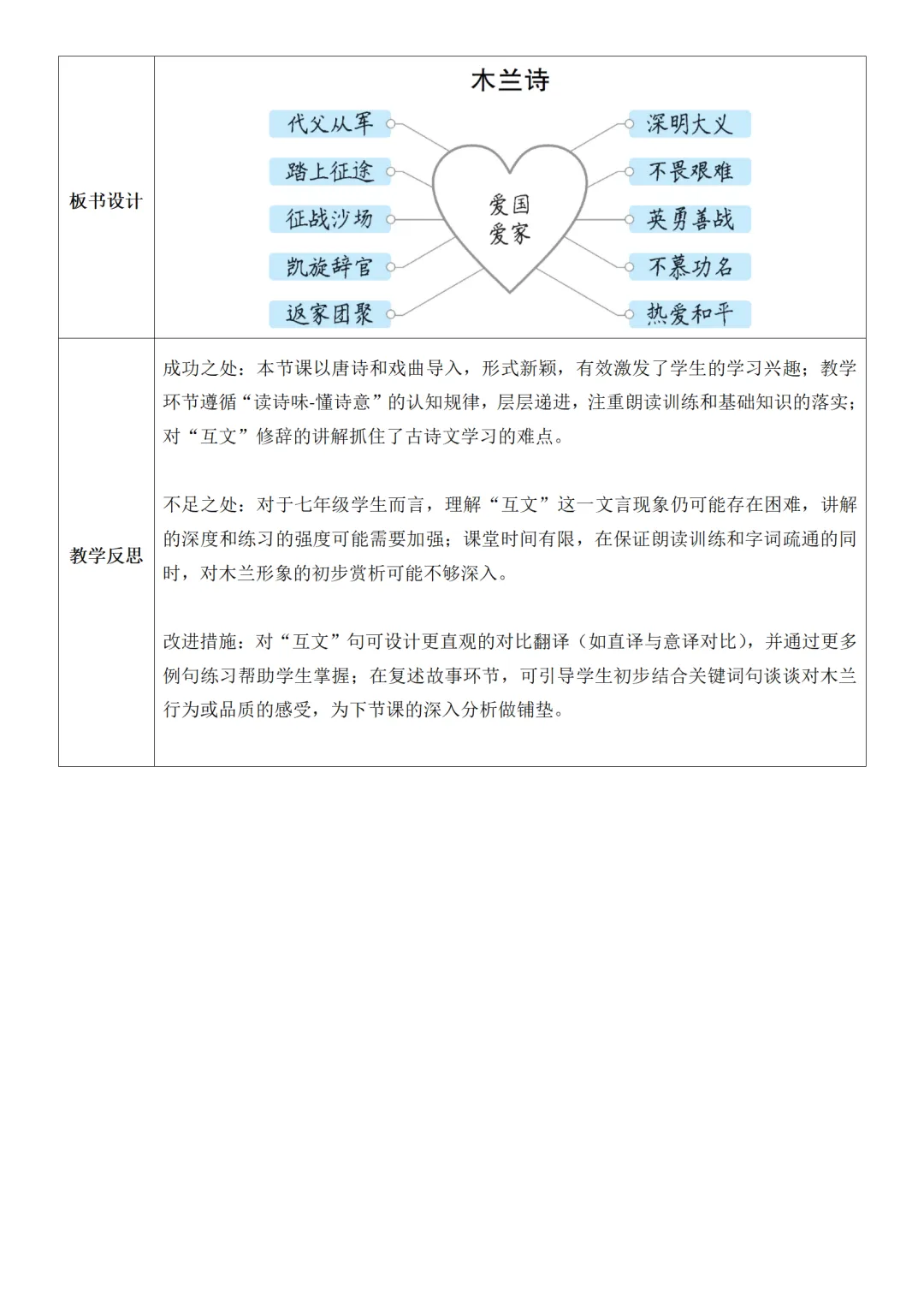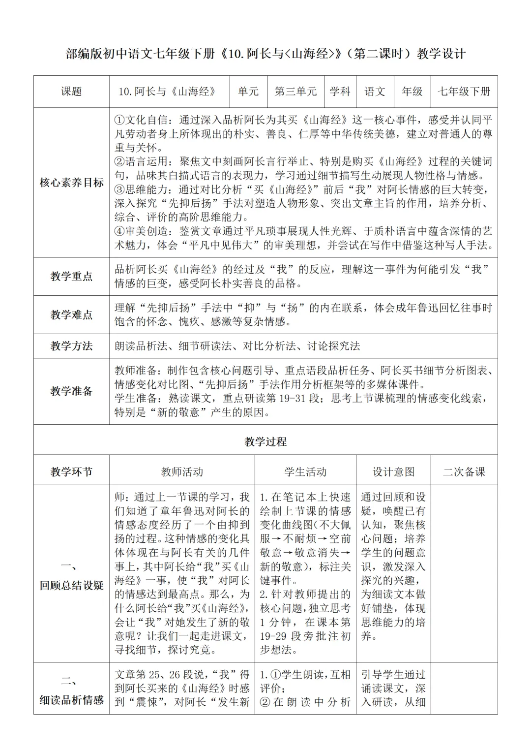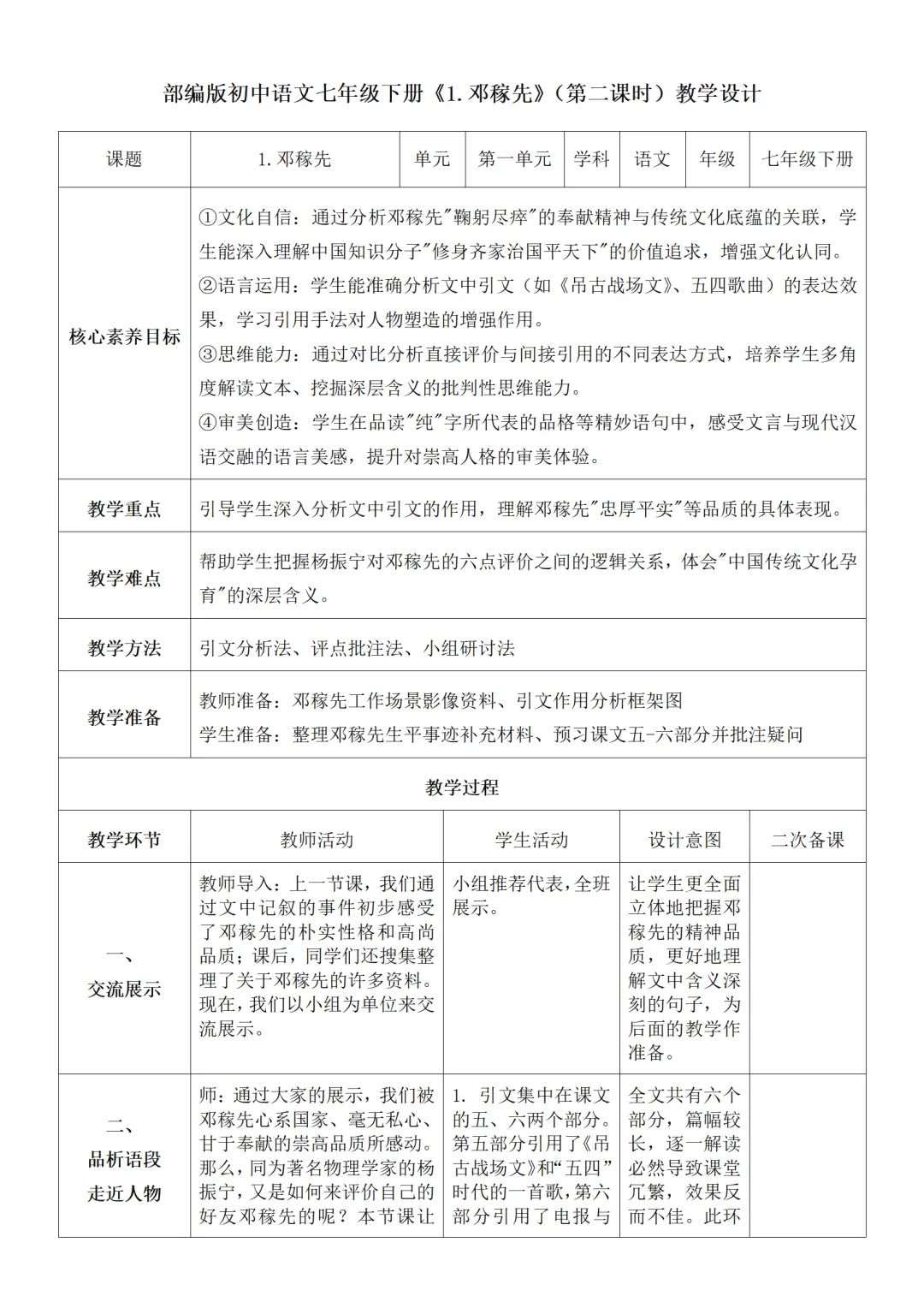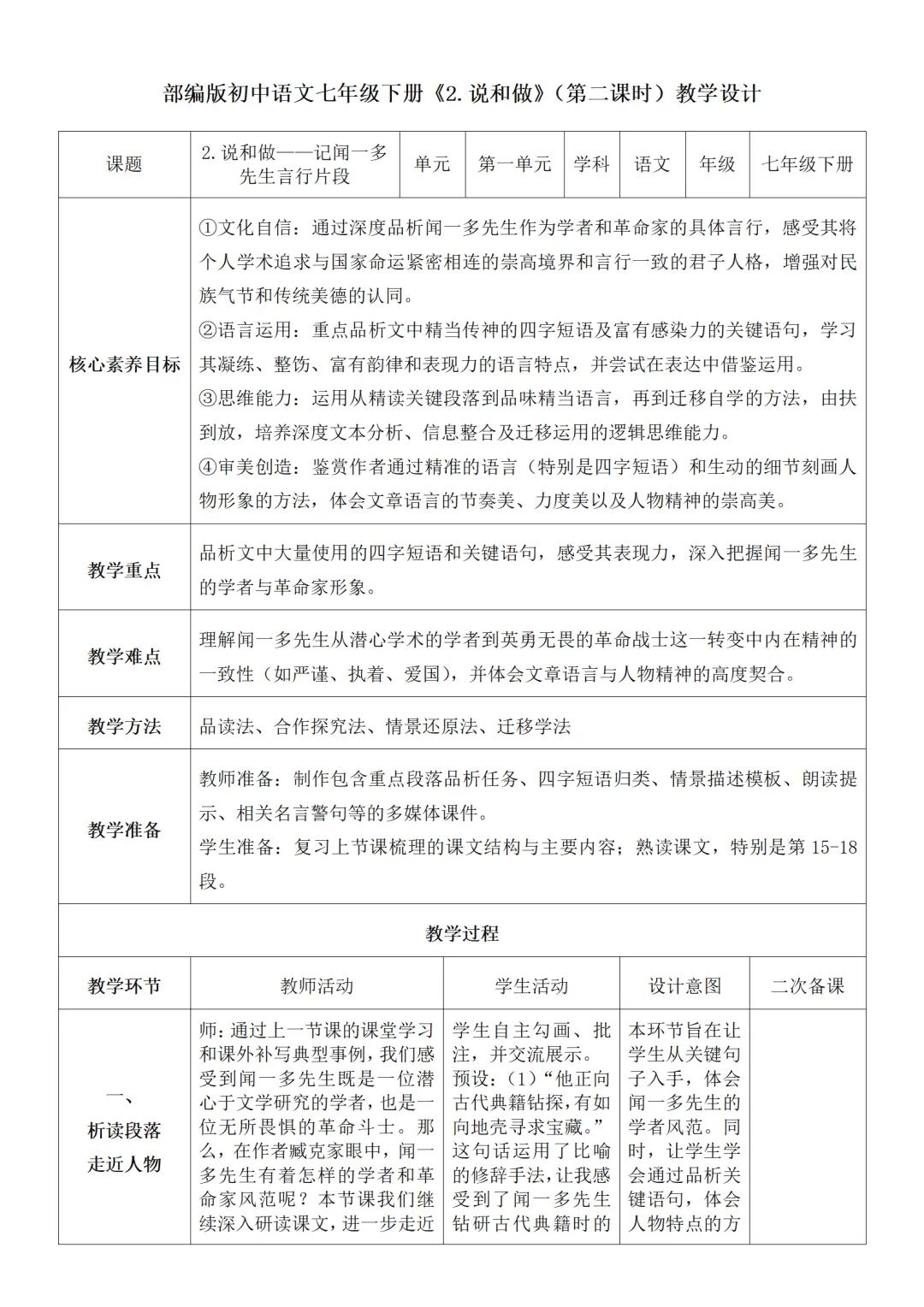 >部编人教版新教材七下语文表格式教案(教学反思有内容)
