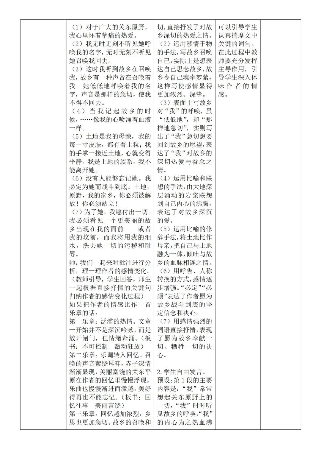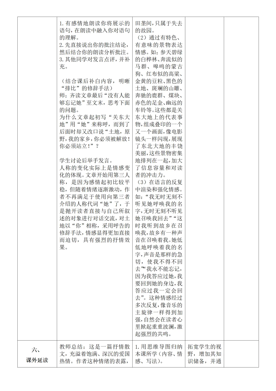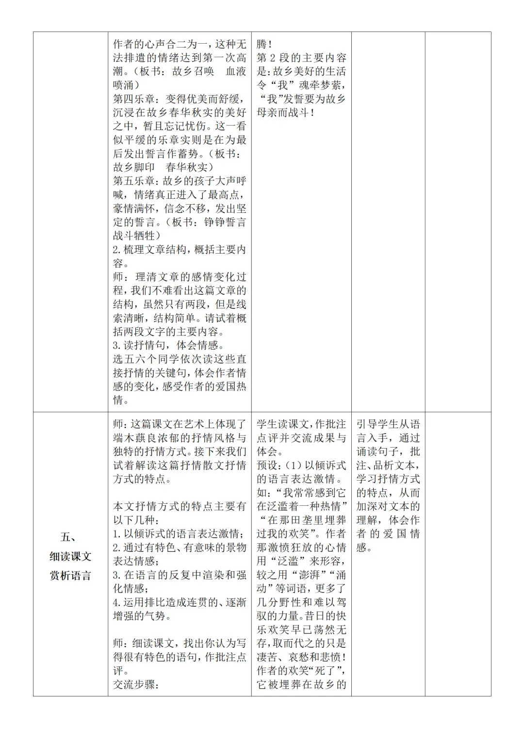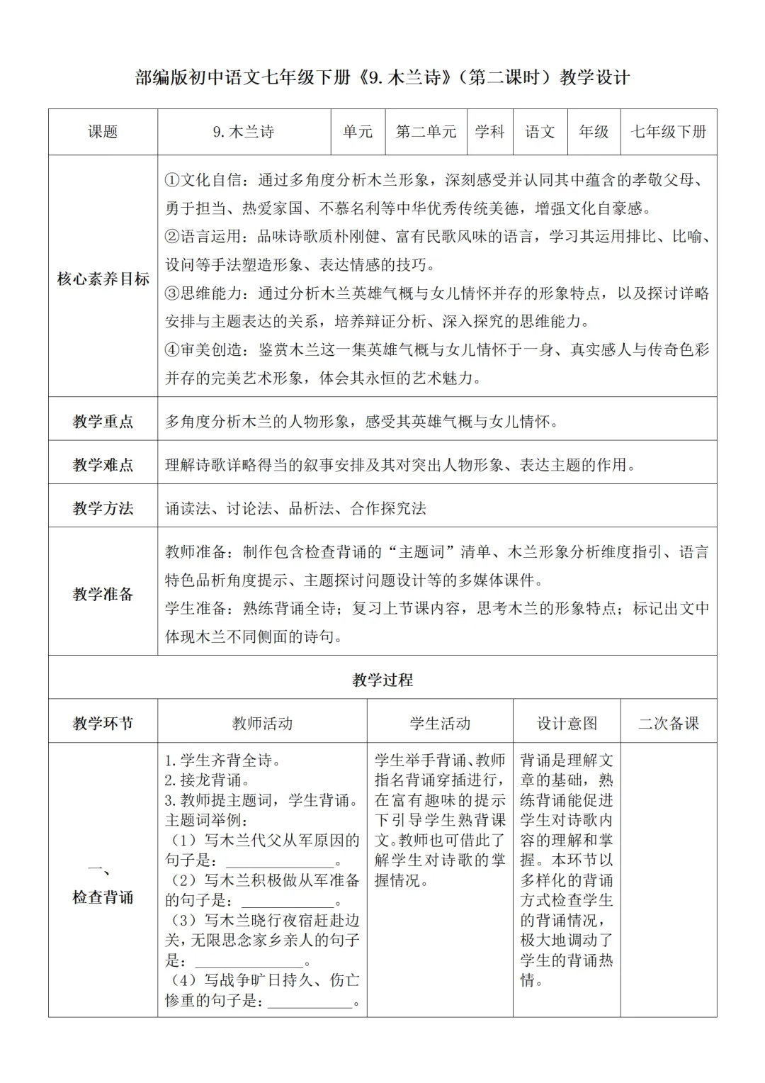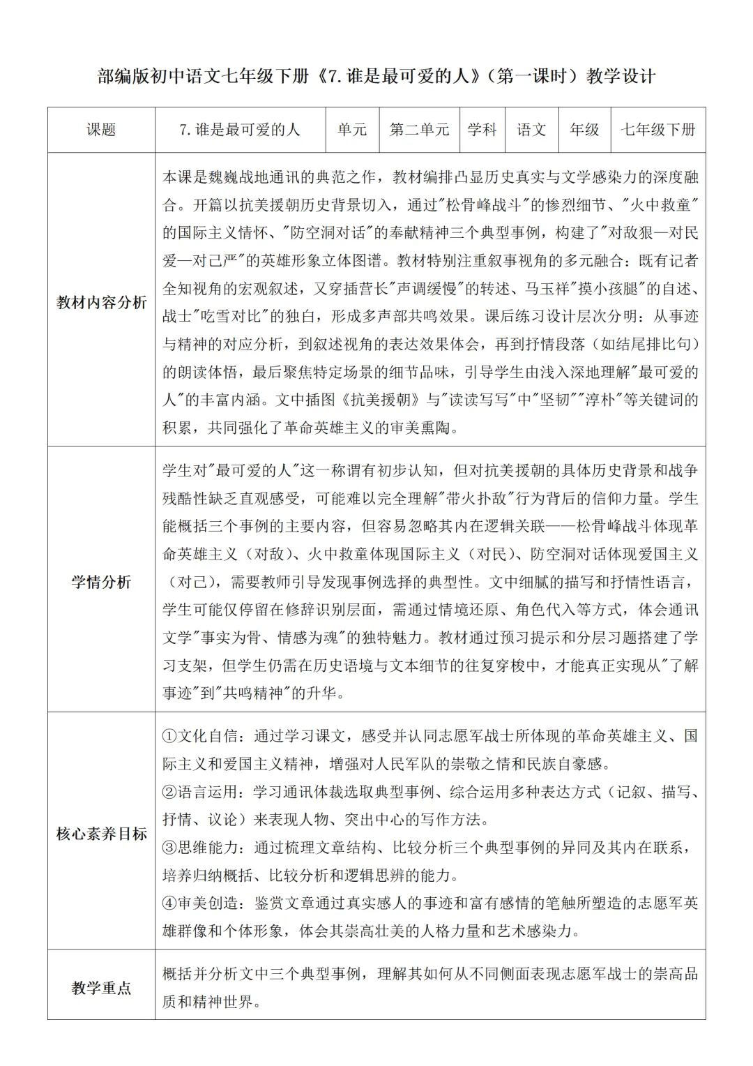 >部编人教版新教材七下语文表格式教案(教学反思有内容)