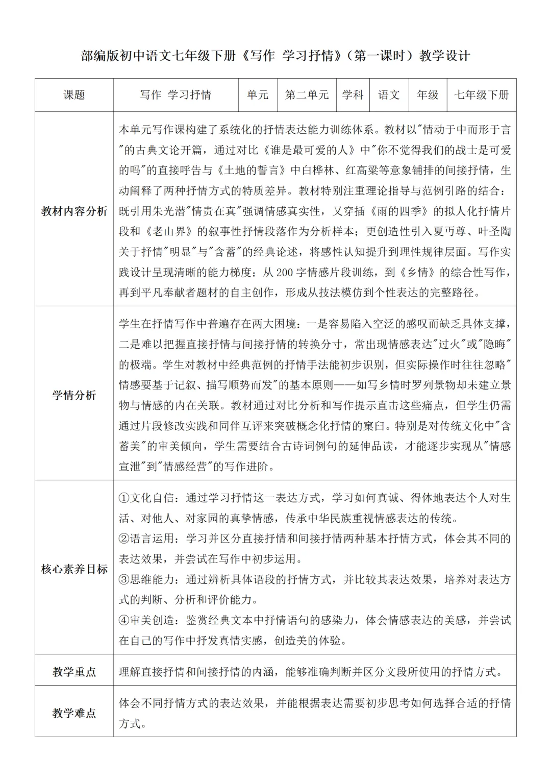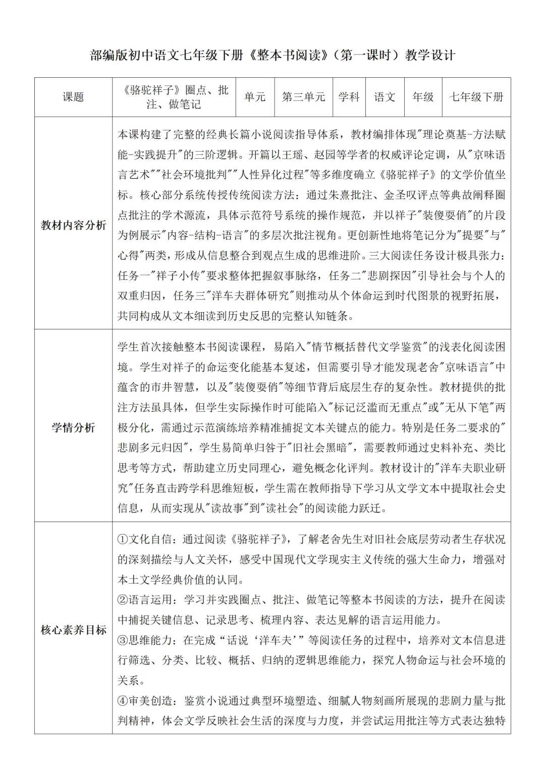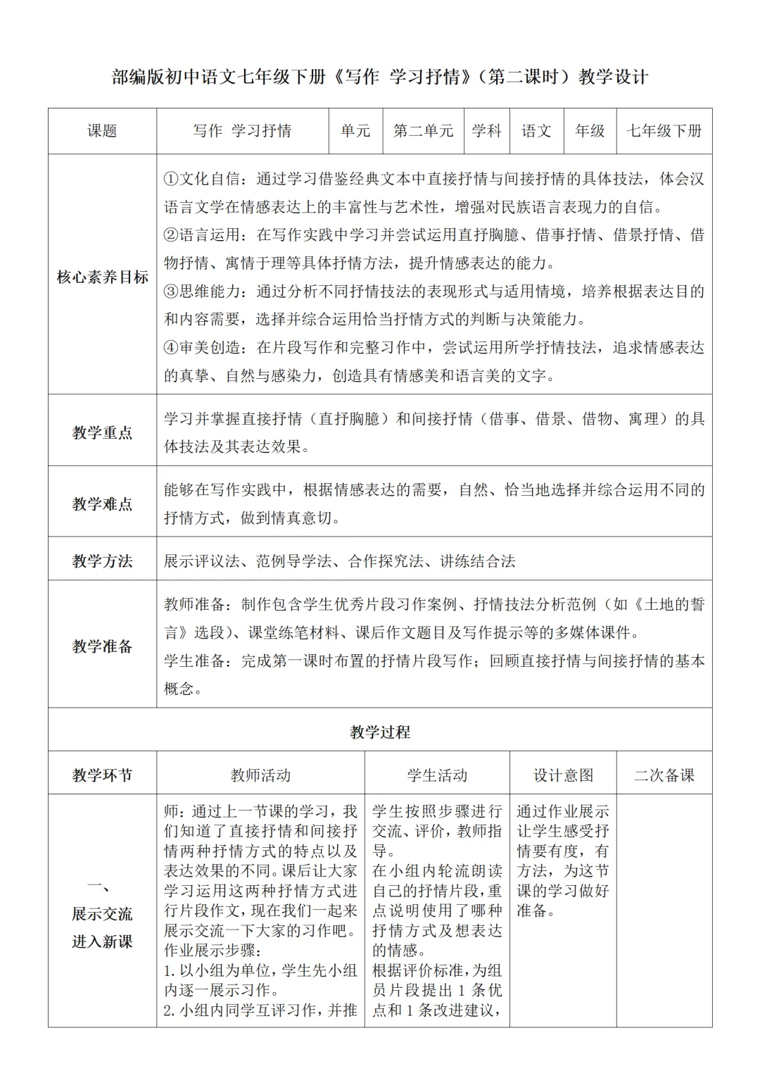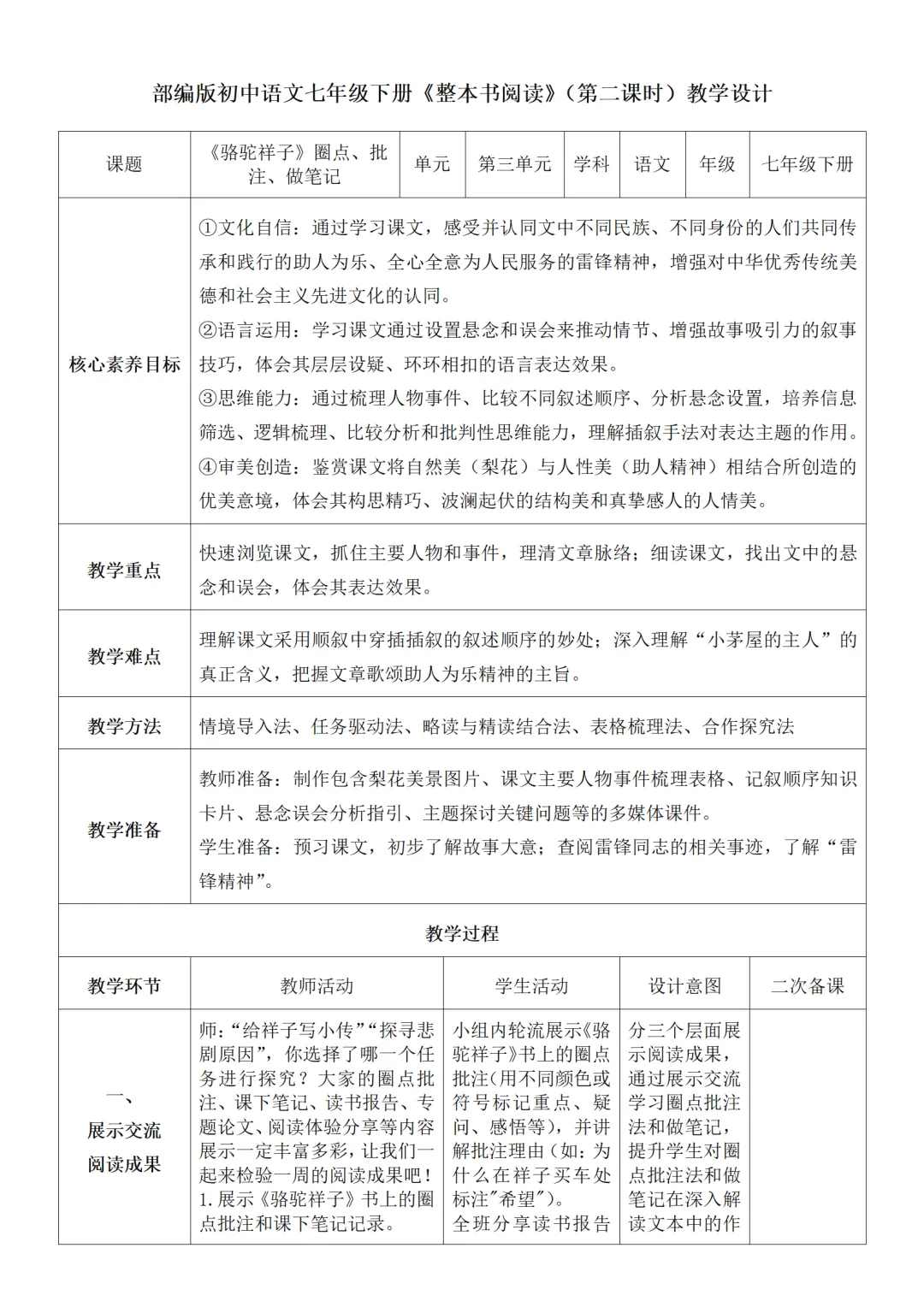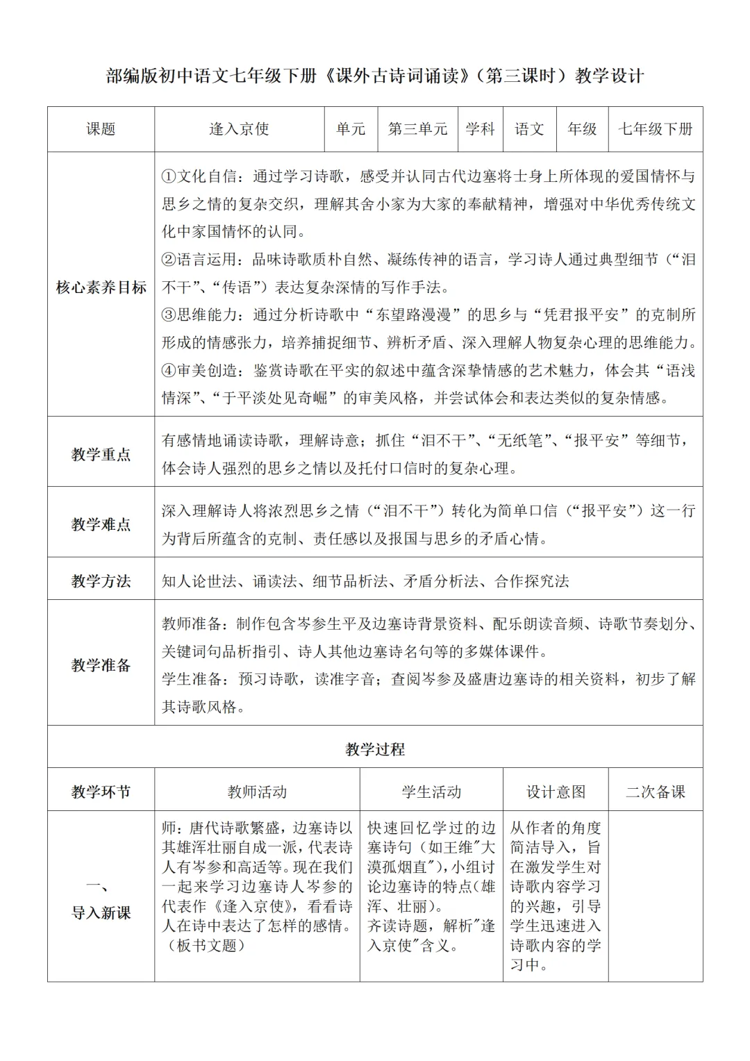 部编人教版新教材七下语文表格式教案(教学反思有内容)