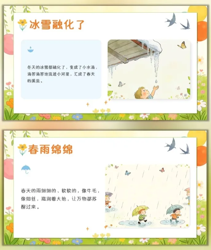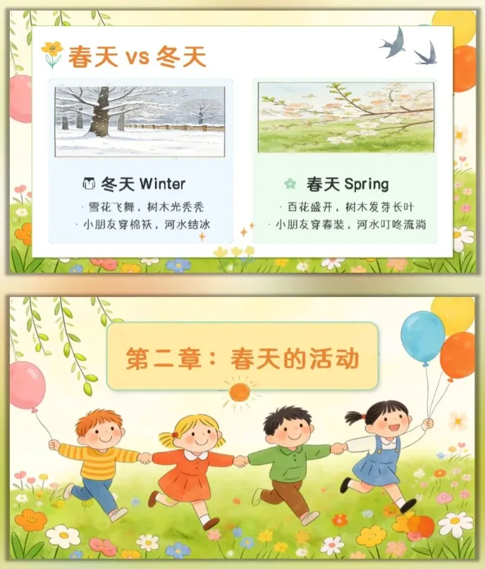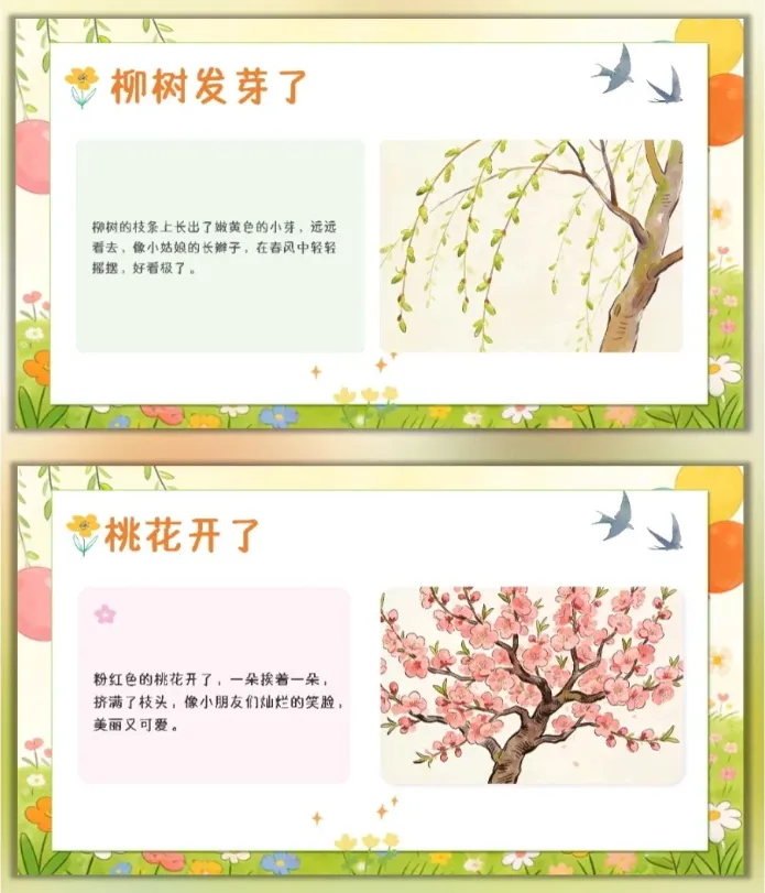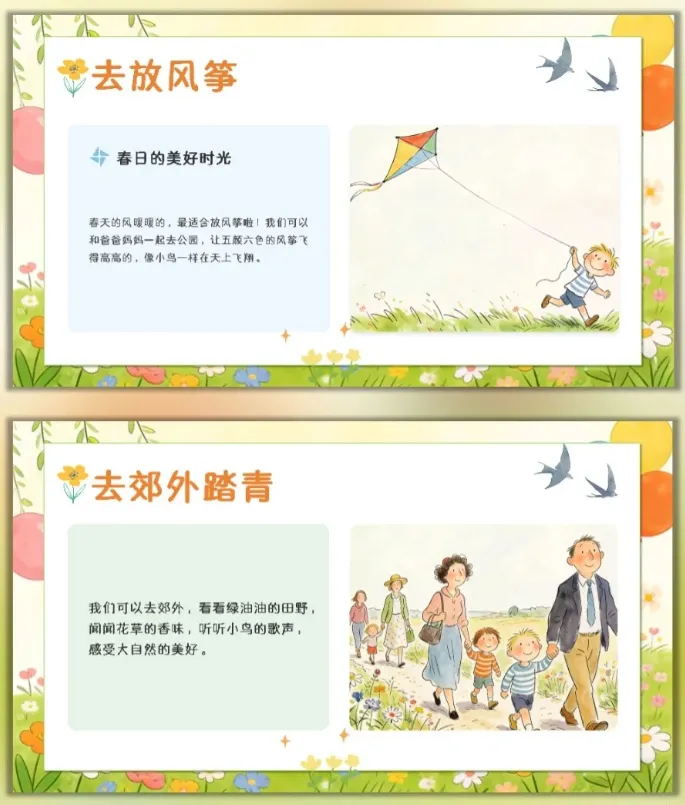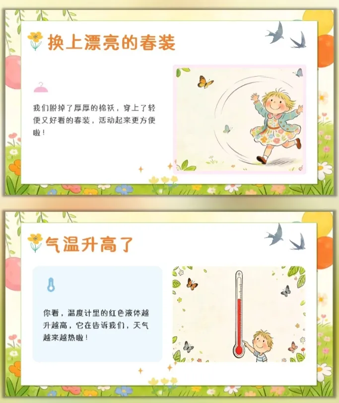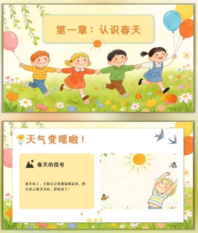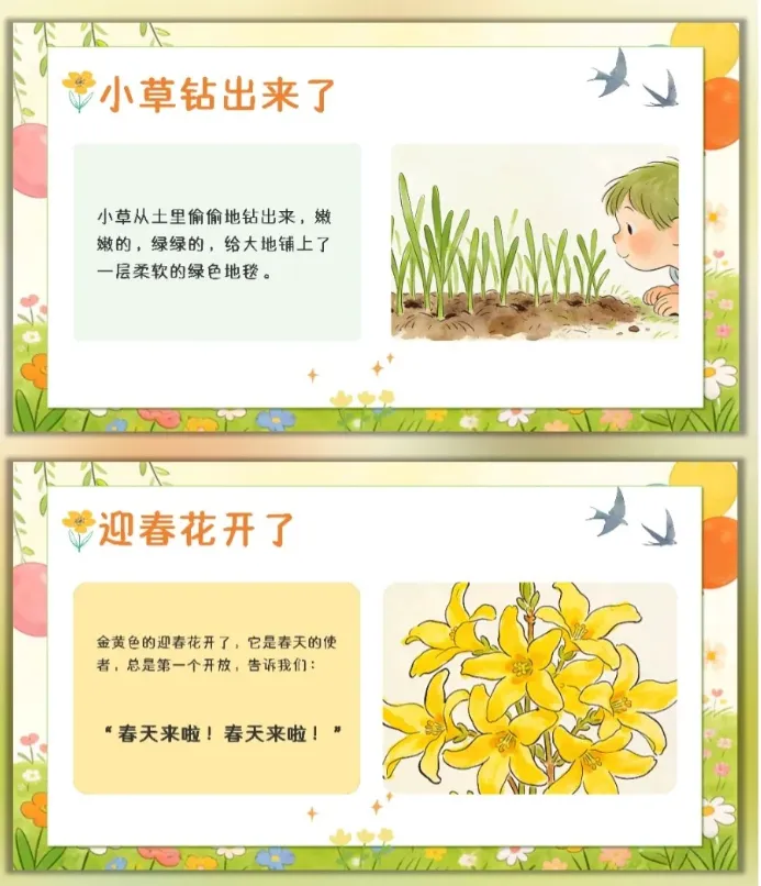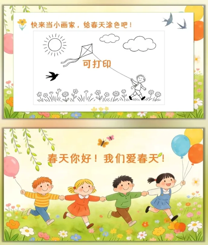 让幼儿感受春天的美好,激发幼儿对大自然的喜爱和探索欲望,愿意参与春天的户外活动,体验与同伴一起感知春天、创作春天的快乐。 活动重点难点 活动重点 帮助幼儿感知春天的季节特征,认识春天里的动植物变化和典型的春季户外活动。 活动难点 引导幼儿用清晰、简单的语言表达自己对春天的发现和感受,将对春天的认知转化为涂色创作的思路。