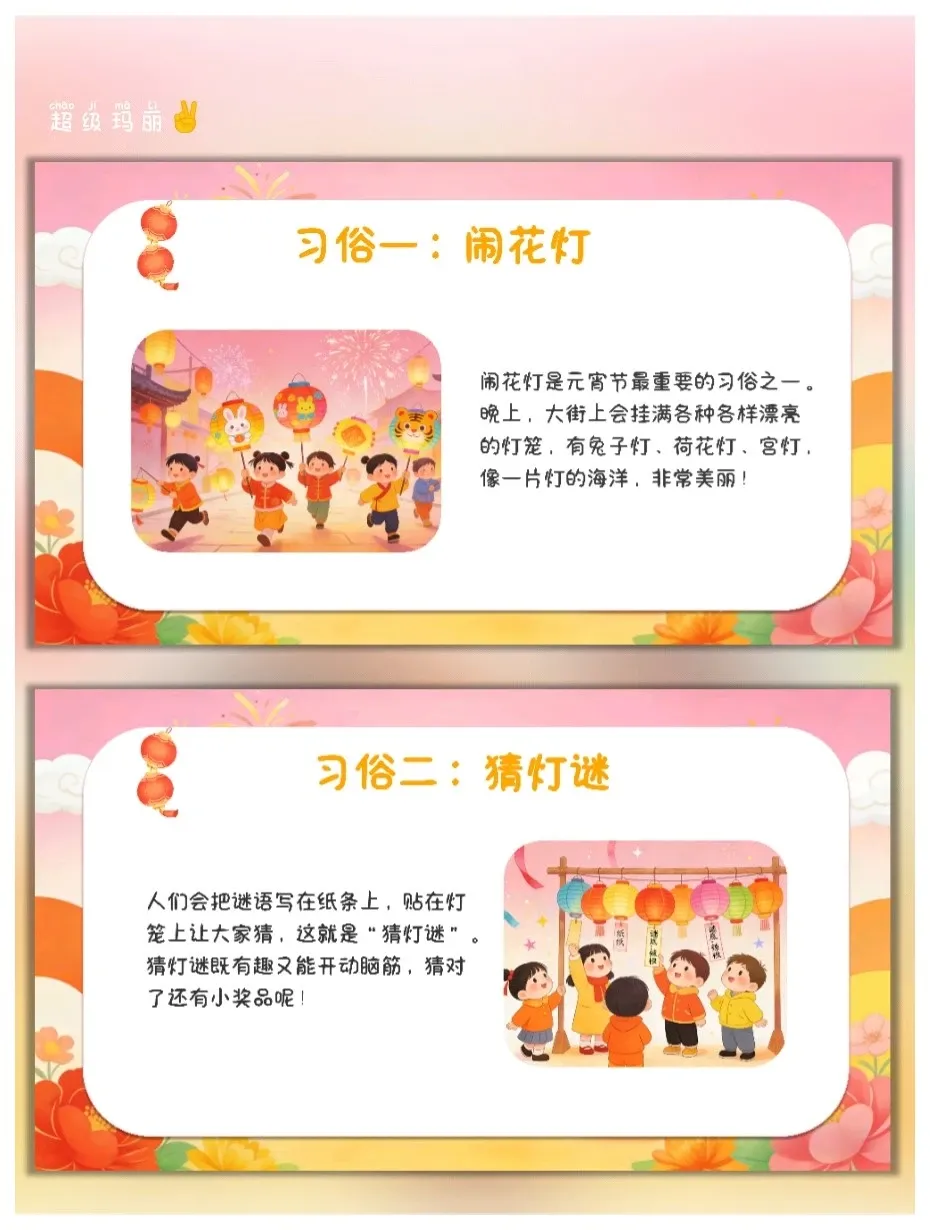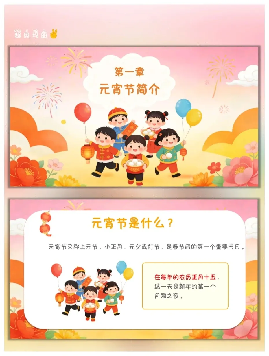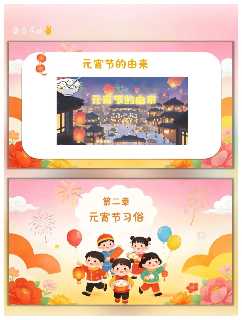 元宵节是我国传统民俗节日,承载着团圆、喜庆的文化内涵,也是幼儿感受中华传统文化的重要载体。本次活动结合PPT中的元宵节知识,以趣味化、游戏化的形式,让幼儿了解元宵节的由来、习俗,区分元宵和汤圆的不同,通过猜灯谜、看插画等互动环节,激发幼儿对传统节日的喜爱,培养幼儿的观察力、表达力和动手感知能力,让幼儿在轻松愉快的氛围中感受元宵节的欢乐与温暖。 活动目标