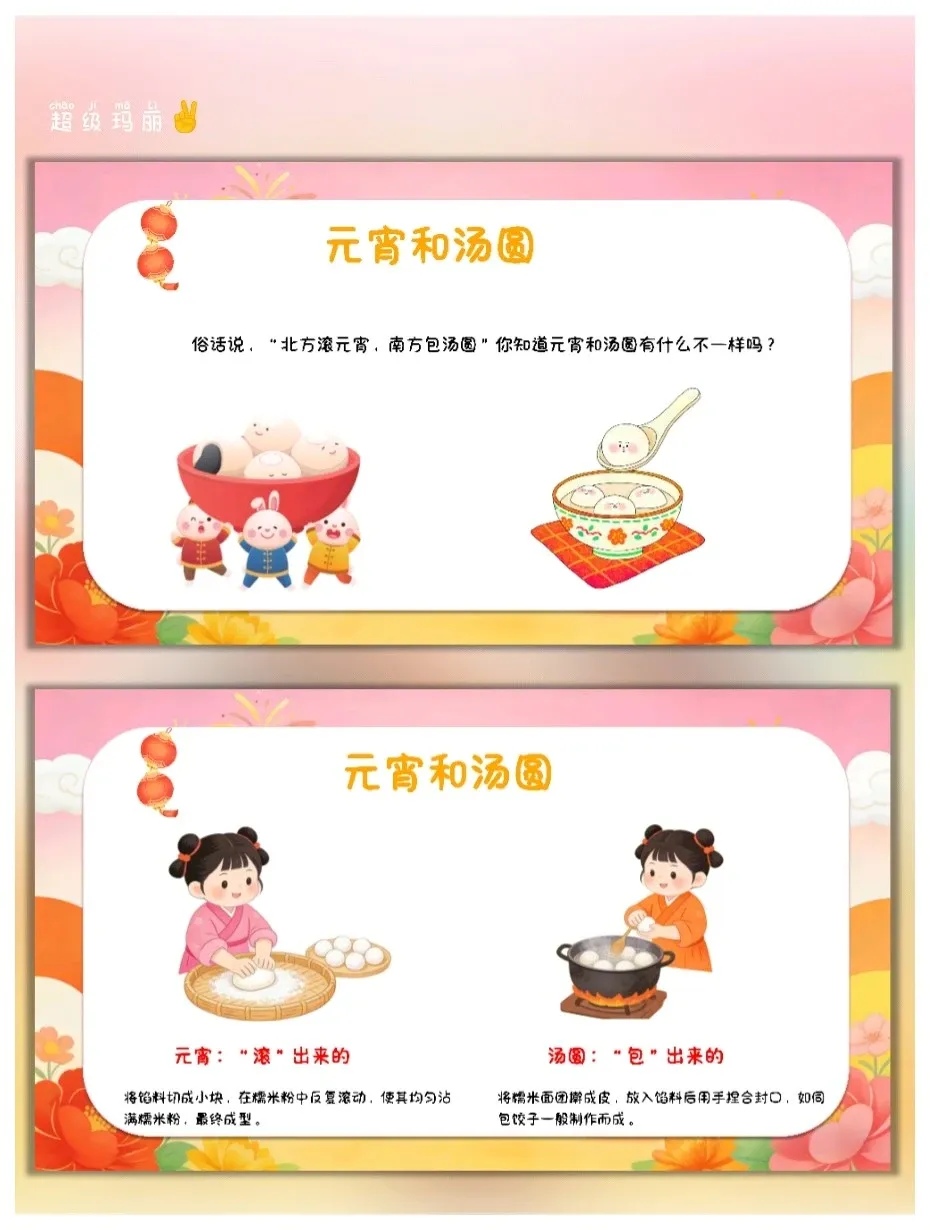 认知目标:知道元宵节是农历正月十五,了解元宵节的别称(上元节、灯节),熟悉闹花灯、猜灯谜、舞龙舞狮等主要习俗,能区分元宵和汤圆的制作方法、口感差异。