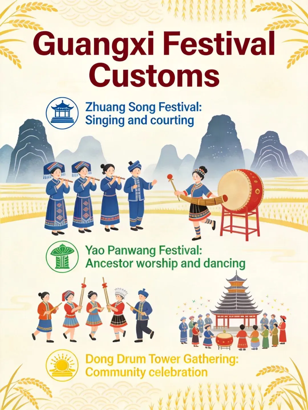• 三月三歌圩(壮族):时间为农历三月初三,习俗有对歌、抛绣球、吃五色糯米饭、跳竹竿舞。注意事项:参与对歌时要礼貌回应,五色糯米饭是用天然植物染色的,体现了广西人民爱护自然、利用自然的智慧。