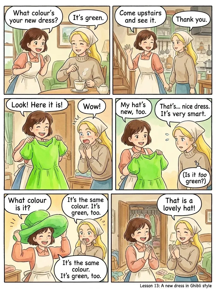 情景说明:这是一个温馨的家庭场景。安娜(Anna)买了一件新连衣裙,她的家人或朋友路易斯(Louise)注意到了并询问颜色。安娜热情地邀请路易斯上楼去亲眼看看。在展示时,路易斯对连衣裙给予了赞美("好看"、"时髦")。安娜随后提到她的帽子也是新的,路易斯自然地问起帽子的颜色,安娜回答颜色与连衣裙相同。对话以路易斯对帽子的再次赞美结束。整个对话展现了日常生活中分享购物喜悦、相互欣赏的简单快乐,语言朴实但情感积极。