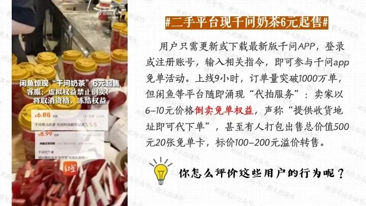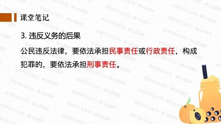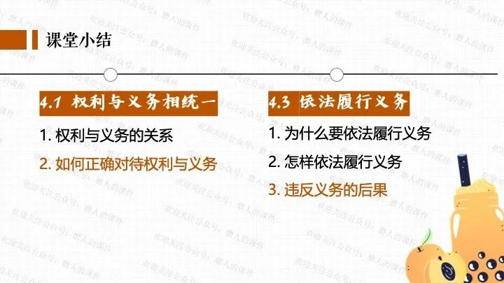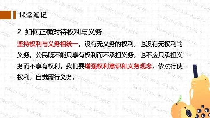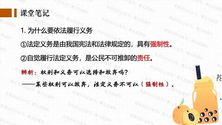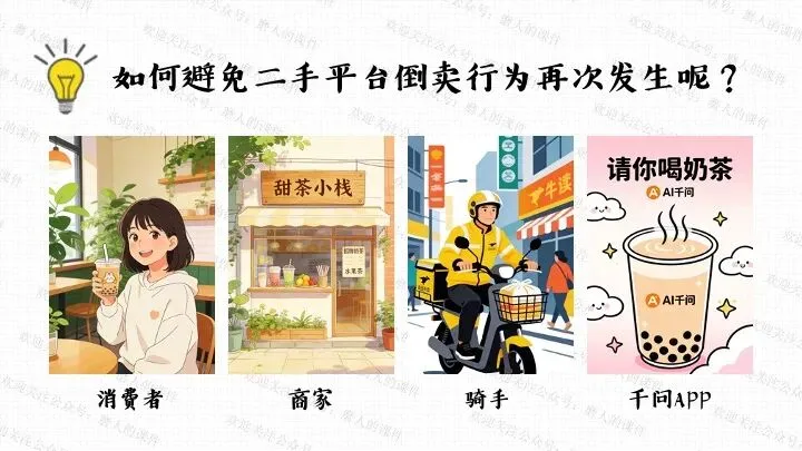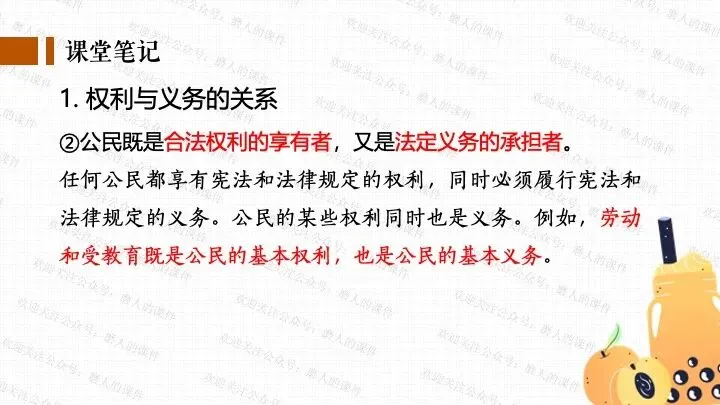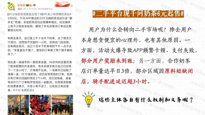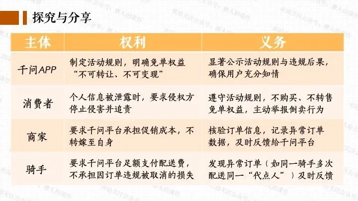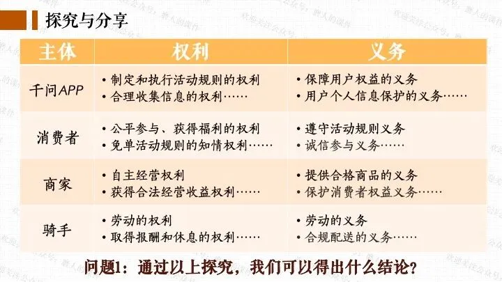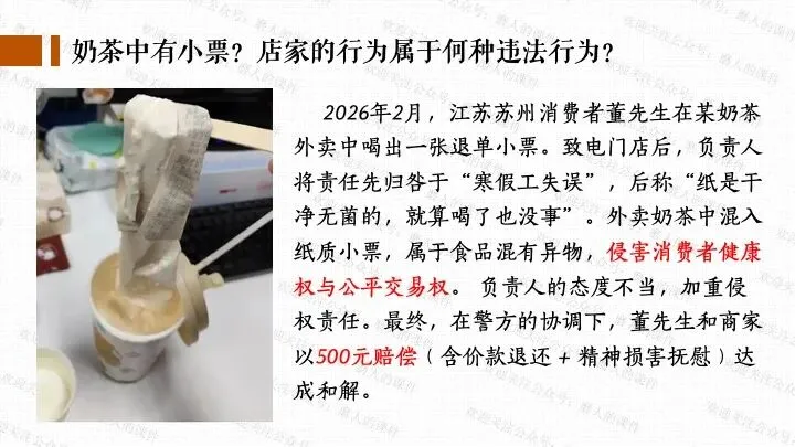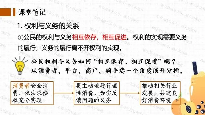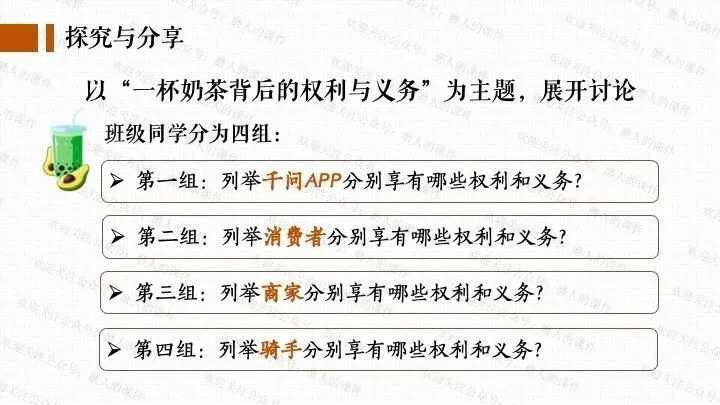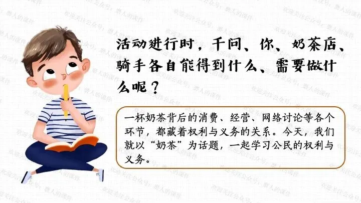 我以千问APP春节奶茶福利热点话题,引出一杯奶茶背后的平台、消费者、商家、骑手的权利与义务话题;分别通过二手平台倒卖免单权益、奶茶店违规宣传、网络散播奶茶谣言等真实消费场景中发生的实际事例,辅以探究性问题,层层递进,帮助学生更好地学习和理解公民的权利与义务。课件逻辑清晰,素材丰富,兼具知识讲授和价值引导。