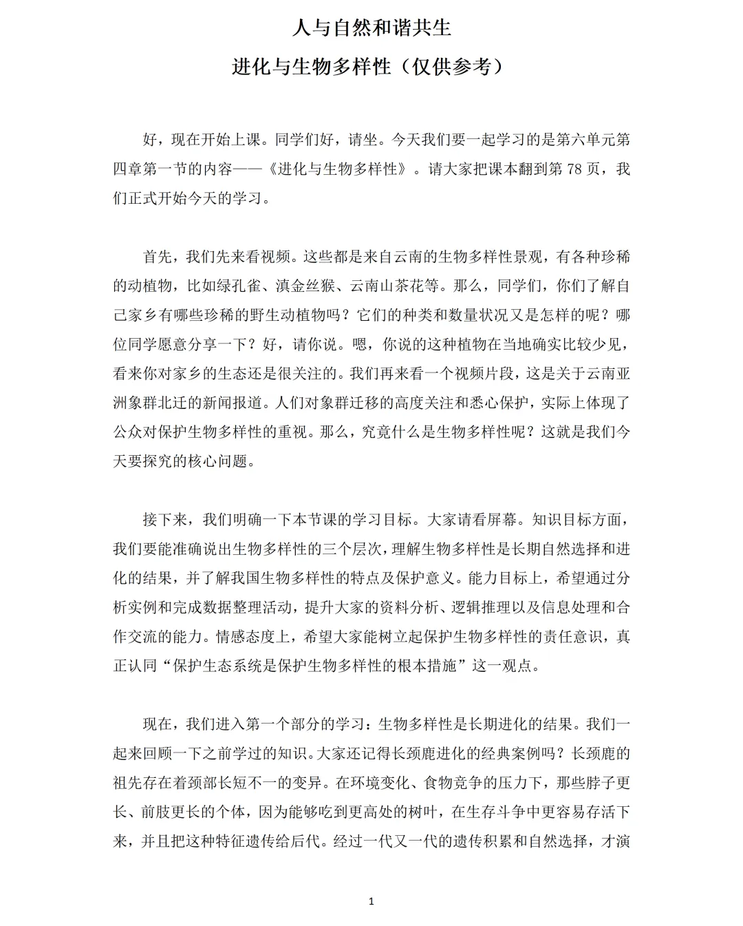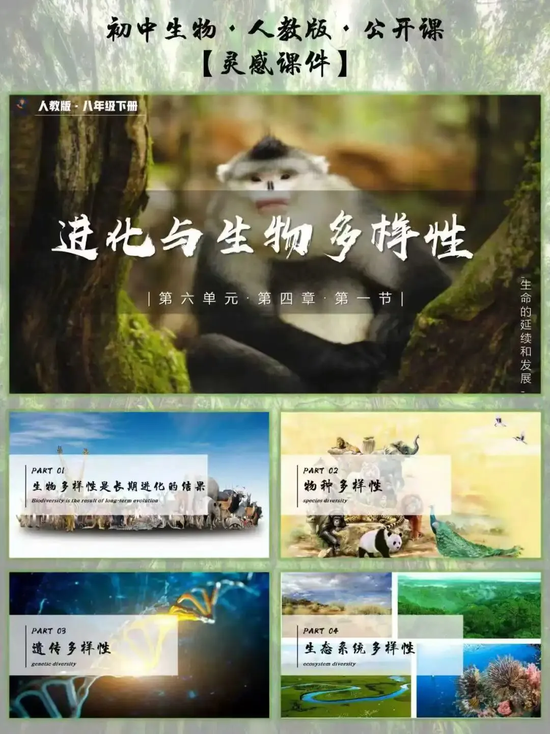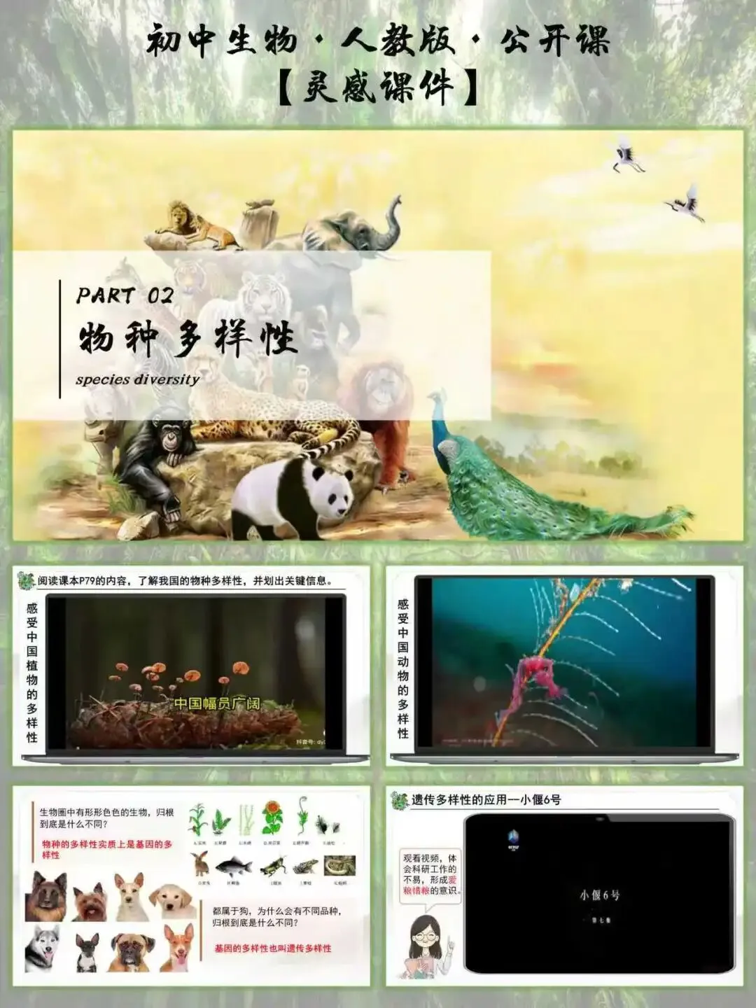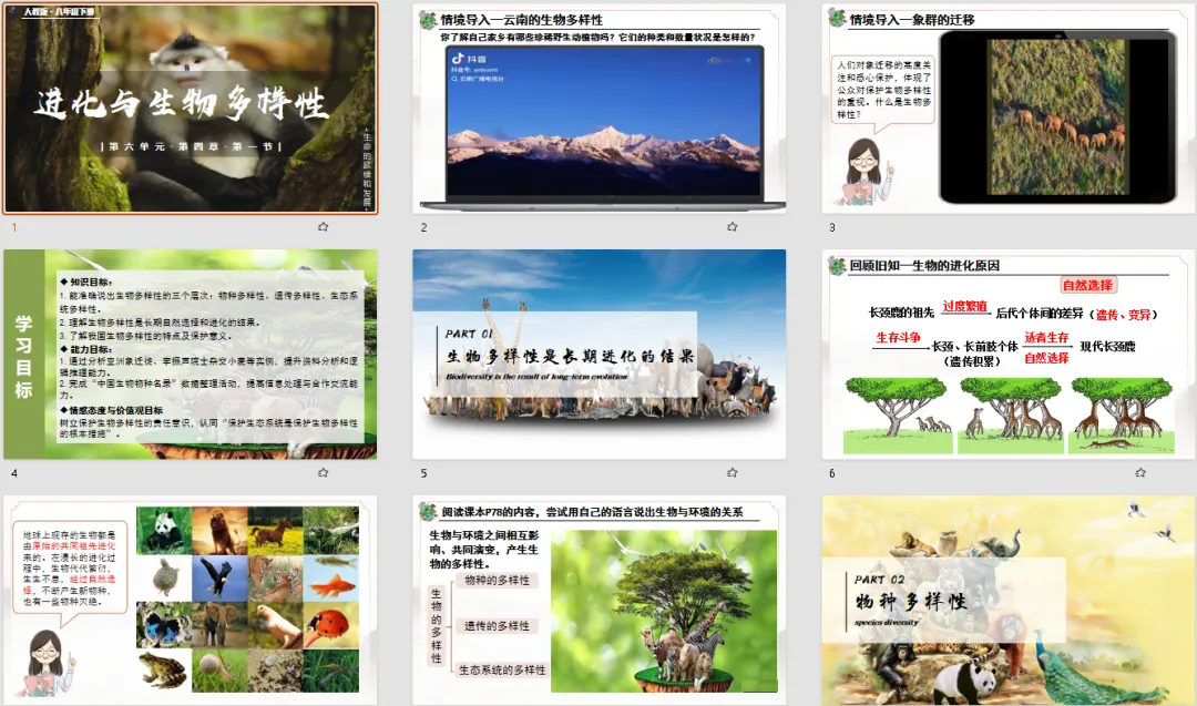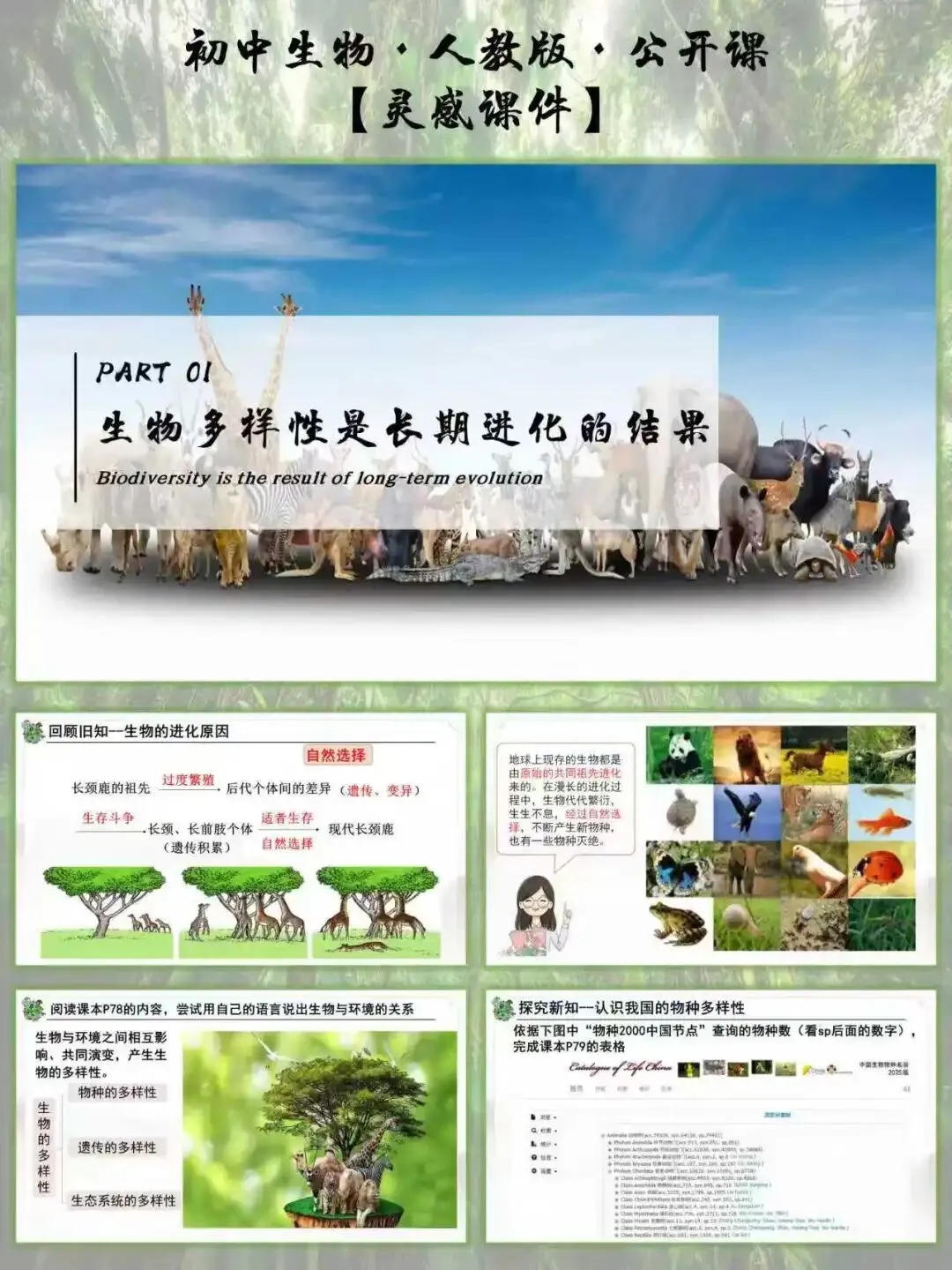 这节课最妙的是 “不孤立讲多样性”,而是把 “进化” 作为核心主线贯穿始终:先回顾长颈鹿的自然选择案例,引导学生理解 “遗传变异 + 环境选择” 的进化逻辑,再自然推导 “长期进化形成生物多样性” 的核心结论。
