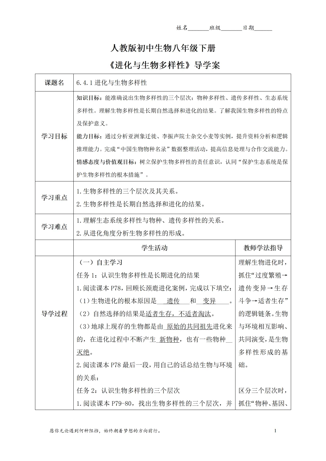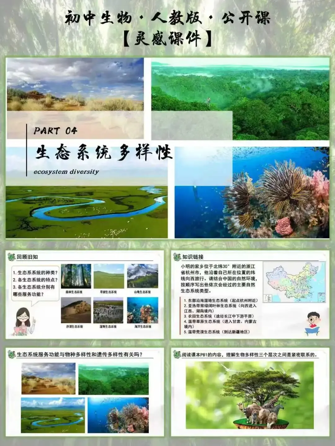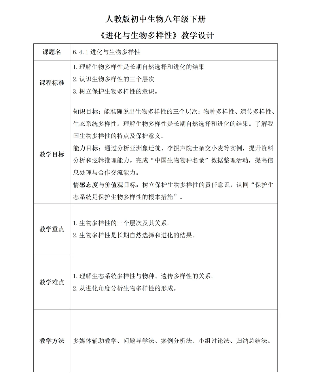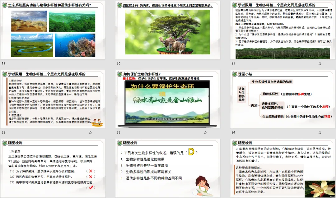 生物多样性的三个层次(物种、遗传、生态系统)是重点,也是学生容易混淆的点。教学设计用 “层层递进 + 实例支撑” 的方式,把概念拆解得明明白白,从具体到抽象,从生活到科学,每个层次都有实例佐证,学生再也不用死记硬背定义,理解更透彻。