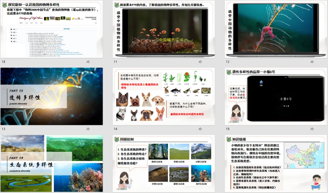 这种设计让学生明白,生物多样性不是凭空产生的,而是亿万年自然选择和生物与环境共同演变的结果。既串联了前面《生物进化的原因》等知识点,又让 “多样性” 的形成有了科学依据,构建起完整的知识体系,避免了知识点碎片化。