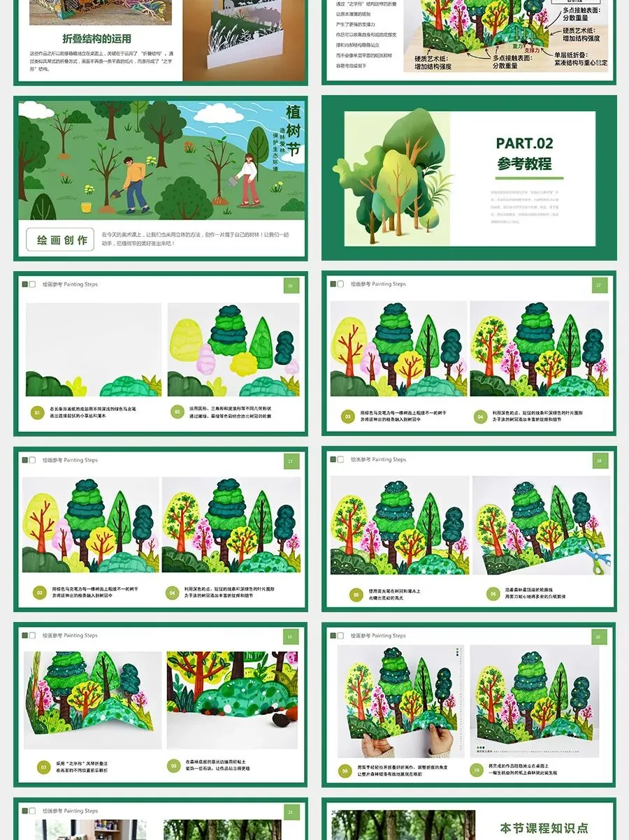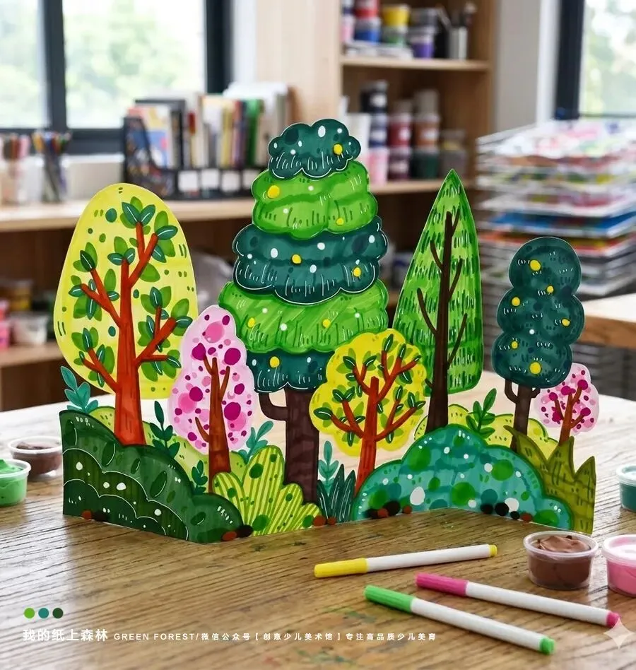 今天我们要学习一种简单又有趣的方法——“之字形”的风琴折叠。通过一前一后的折叠,画纸就会形成稳定的结构,让我们画好的森林像小舞台一样立起来。准备好了吗?让我们一起开始这场充满绿色和想象的创作之旅吧!