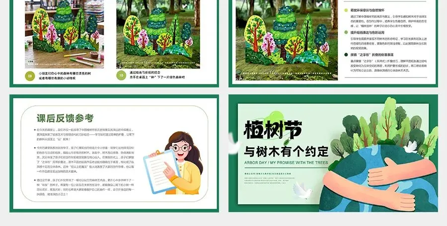 想一想,在这张长长的画纸上,你心目中的森林会是什么样子呢?也许有高高挺立的松树、柔软飘动的垂柳,也可能是开满鲜花、充满神秘感的大树。你还可以在森林里画上忙碌的小鸟、飞舞的蝴蝶,或者蹦蹦跳跳的小兔子。让我们用彩色的画笔,把春天那份生机勃勃、充满希望的绿色都画出来,让这片森林在画纸上慢慢“生长”。不过,我们的画纸原本是平平的,怎样才能让这片森林像真的一样站立在桌面上呢?