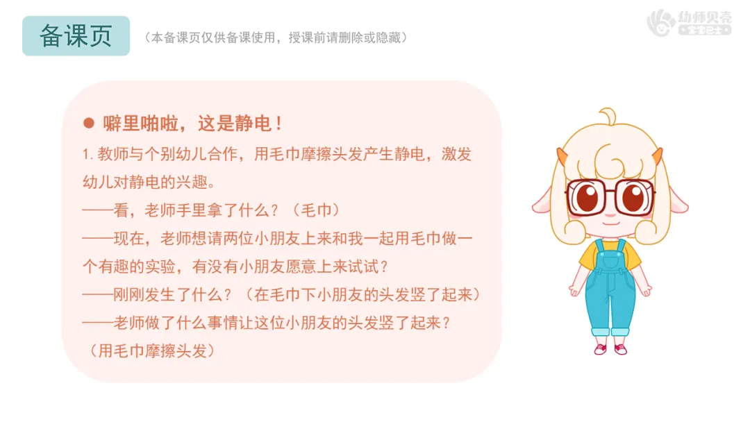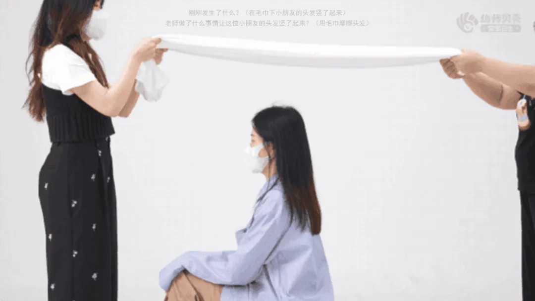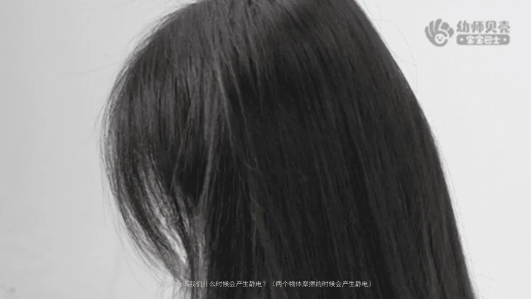 ——老师做了什么事情让这位小朋友的头发竖了起来?(用毛巾摩擦头发)
