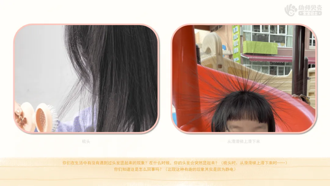 ——你们在生活中有没有遇到过头发竖起来的现象?在什么时候,你的头发会突然竖起来?(梳头时、从滑滑梯上滑下来时……)