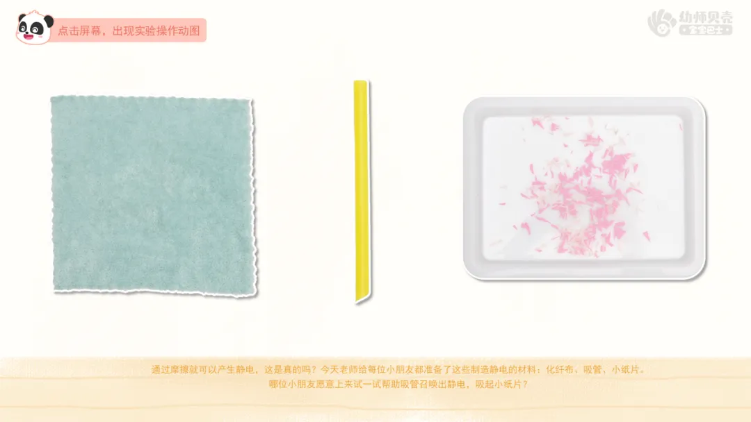 ——哪位小朋友愿意上来试一试帮助吸管召唤出静电,吸起小纸片?