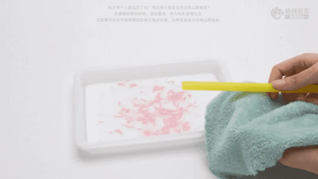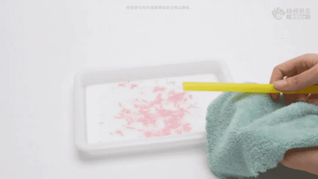 小结:在摩擦吸管的时候,速度要快、用力地多摩擦几次,注意要用化纤手套摩擦过的地方靠近纸屑,这样就能成功召唤出静电啦。