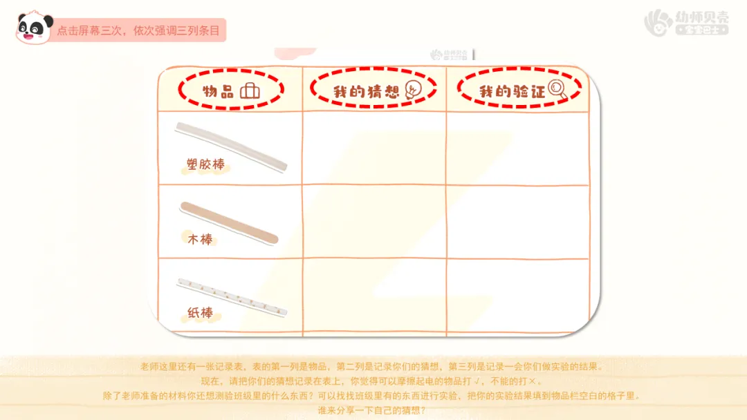 ——老师这里还有一张记录表,表的第一列是物品,第二列是记录你们的猜想,第三列是记录一会你们做实验的结果。现在,请把你们的猜想记录在表上,你觉得可以摩擦起电的物品打√,不能的打×。