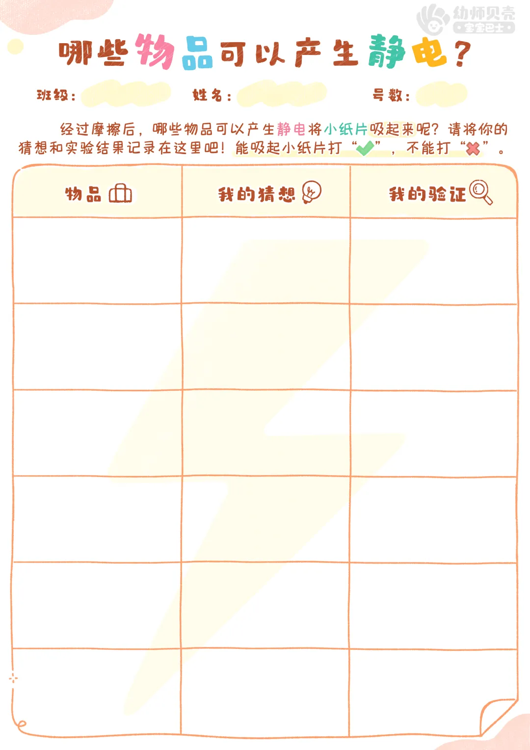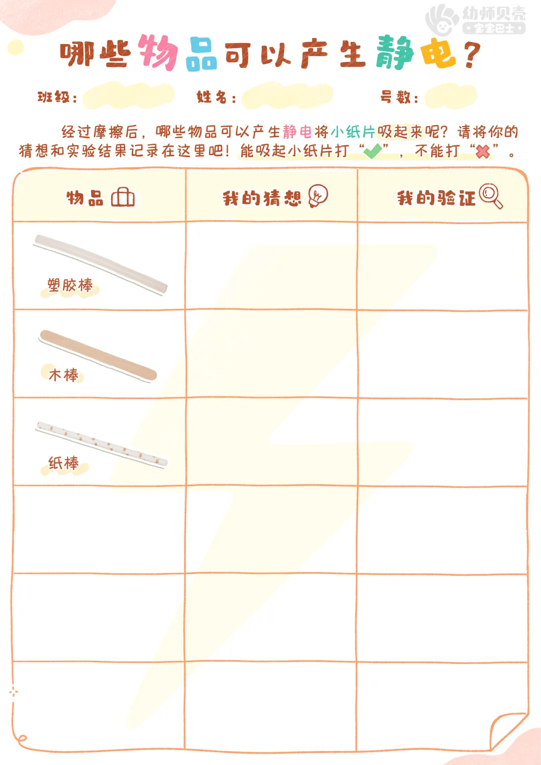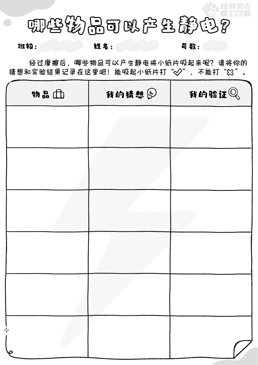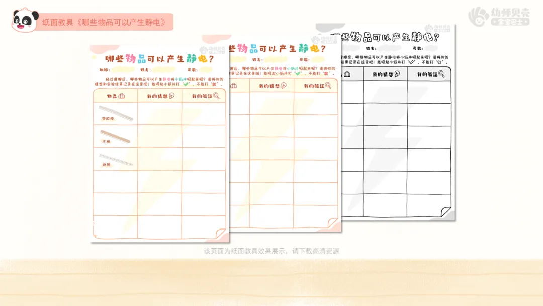 l纸面教具:《哪些物品可以产生静电》实验记录表。