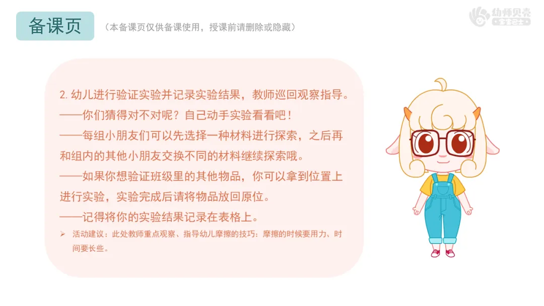 Ø活动建议:此处教师重点观察、指导幼儿摩擦的技巧:摩擦的时候要用力、时间要长些。