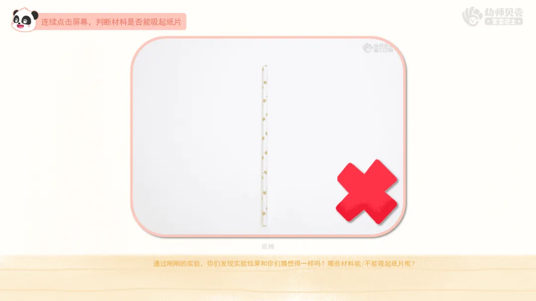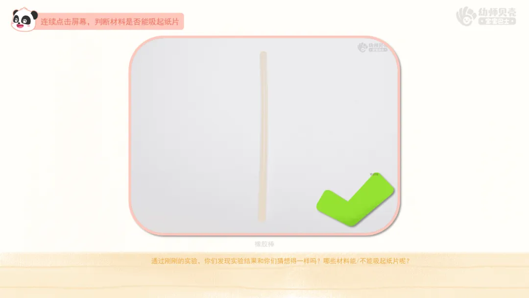 ——通过刚刚的实验,你们发现实验结果和你们猜想得一样吗?哪些材料能/不能吸起纸片呢?