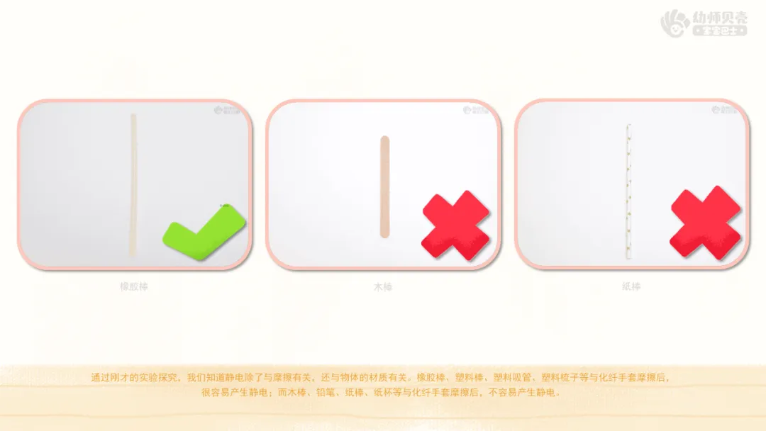 小结:通过刚才的实验探究,我们知道静电除了与摩擦有关,还与物体的材质有关。橡胶棒、塑料棒、塑料吸管、塑料梳子等与化纤手套摩擦后,很容易产生静电;而木棒、铅笔、纸棒、纸杯、不锈钢勺子、铁勺等与化纤手套摩擦后,不容易产生静电。