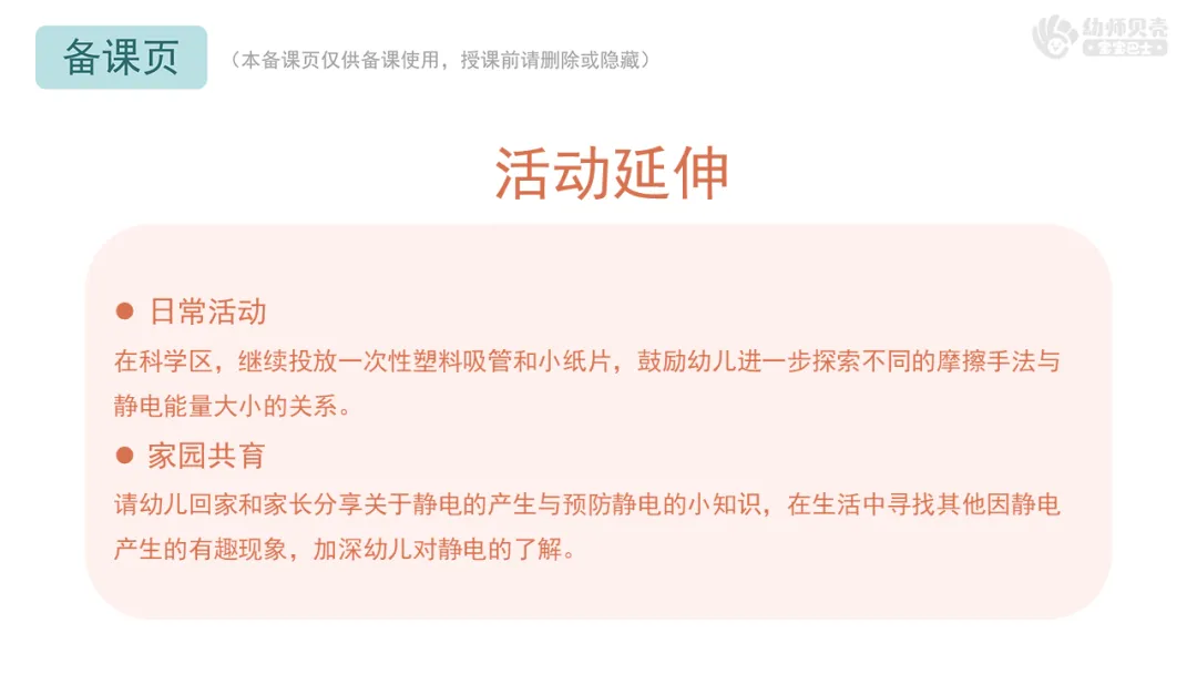 请幼儿回家和家长分享关于静电的产生与预防静电的小知识,在生活中寻找其他因静电产生的有趣现象,加深幼儿对静电的了解。
