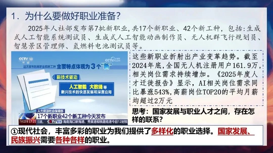首先,我们来思考第一个问题:为什么要做好职业准备?老师给大家带来了一组最新的数据:2025年人社部发布了第7批新职业,包含17个新职业、42个新工种,像生成式人工智能系统测试员、无人机群飞行规划员、智慧景区管理师这些职业,大家听说过吗?(稍作互动)除此之外,《2025年度人才迁徙报告》显示,AI相关岗位的需求同比暴涨了543%,高薪岗位TOP20的平均月薪都超过了2万元。