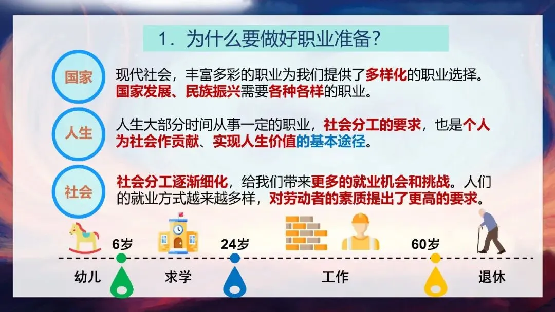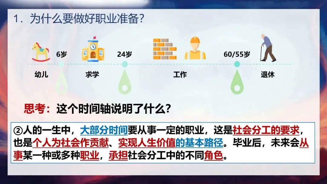 接下来,我们看这张人生时间轴图片(展示时间轴):从6岁进入幼儿时期,到24岁左右完成求学,再到60岁或55岁退休,中间漫长的几十年,我们大部分时间都在工作,都在从事一定的职业。大家想一想,这个时间轴说明了什么?(引导学生思考)对啦,从事职业是我们人生中非常重要的一部分,这是社会分工的要求,也是我们个人为社会作贡献、实现人生价值的基本路径。毕业后,我们都会成为社会分工中的一员,承担不同的角色,所以提前做好职业准备非常有必要。
