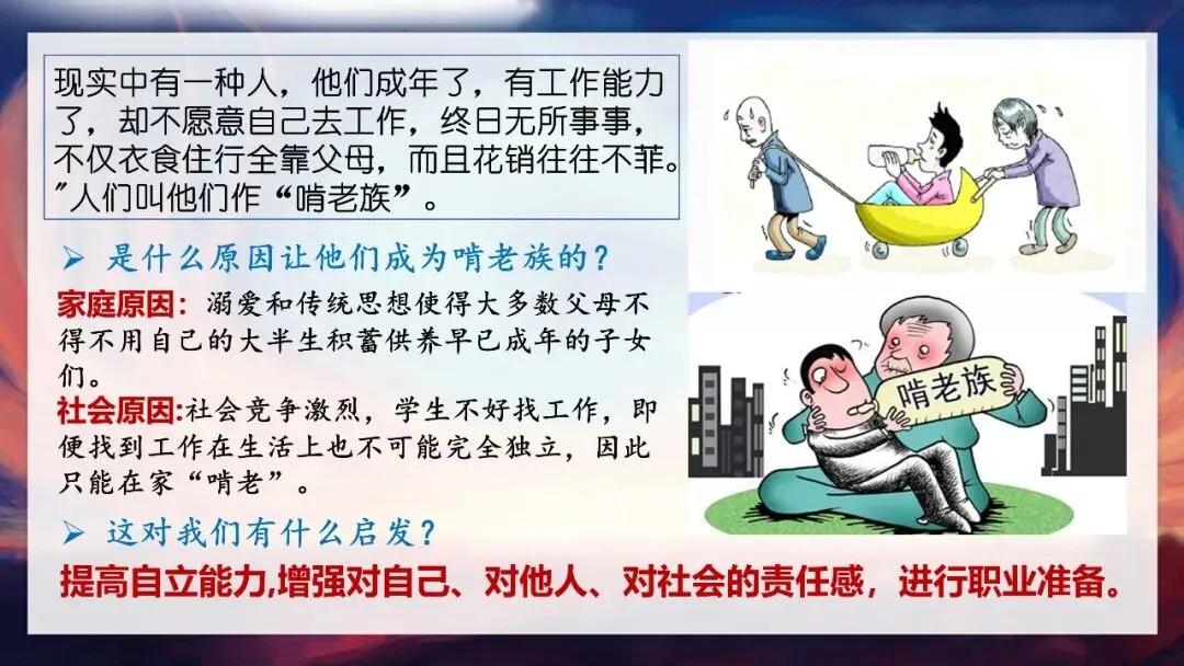 说到职业准备,老师想和大家聊聊“啃老族”这个现象。现实中有些成年人,有工作能力却不愿意工作,衣食住行全靠父母,花销还不小。大家觉得是什么原因让他们成为“啃老族”呢?(邀请学生回答)有的同学提到了家庭溺爱,有的同学说到社会竞争激烈。确实,家庭的过度呵护和社会竞争的压力都是原因之一,但这也给我们敲响了警钟:我们必须提高自立能力,增强对自己、对他人、对社会的责任感,从现在开始就做好职业准备,避免成为“啃老族”。