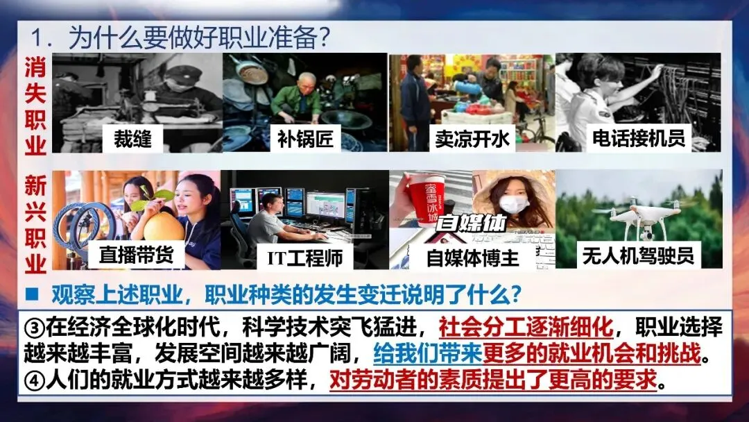 大家再看这组对比图片(展示消失职业与新兴职业):上面是裁缝、补锅匠、电话接线员这些逐渐消失的职业,下边是无人机驾驶员、自媒体博主、IT工程师这些新兴职业。职业种类的这种变迁说明了什么?(给学生思考时间)没错,在经济全球化时代,科学技术突飞猛进,社会分工越来越细,职业选择越来越丰富,发展空间也越来越广阔,这既给我们带来了更多就业机会,也带来了不小的挑战。同时,就业方式越来越多样,对我们劳动者的素质也提出了更高的要求。所以,做好职业准备,提升自身能力,才能更好地适应时代发展。