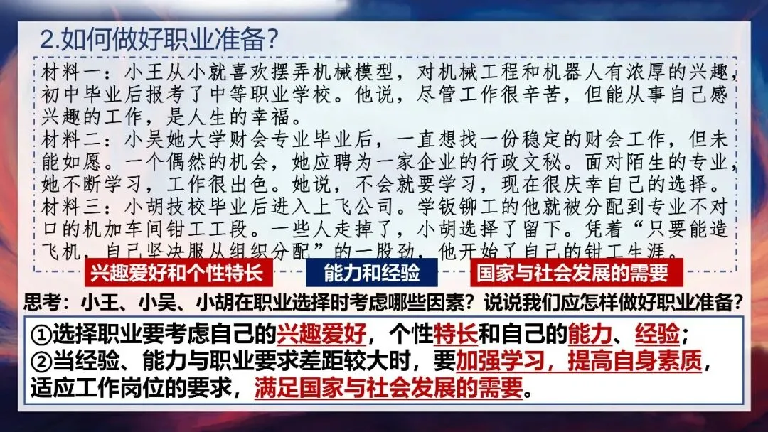 大家思考一下:小王、小吴、小胡在职业选择时都考虑了哪些因素?我们应该怎样做好职业准备?(组织学生分组讨论)好,谁来分享一下你的看法?(邀请学生发言)说得非常全面!小王考虑了自己的兴趣爱好,小吴在职业中不断学习提升能力,小胡则兼顾了国家和社会的需要。