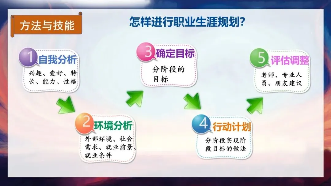 除了这些,我们还可以制定一份职业生涯规划,这能帮助我们更清晰地明确方向。职业生涯规划有五个关键步骤:第一步是自我分析,全面了解自己的兴趣、爱好、特长、能力和性格;第二步是环境分析,关注外部环境、社会需求、就业前景和就业条件;第三步是确定目标,制定分阶段的短期、中期和长期目标;第四步是行动计划,明确每个阶段实现目标的具体做法;第五步是评估调整,根据老师、专业人员和朋友的建议,以及实际情况不断优化规划。