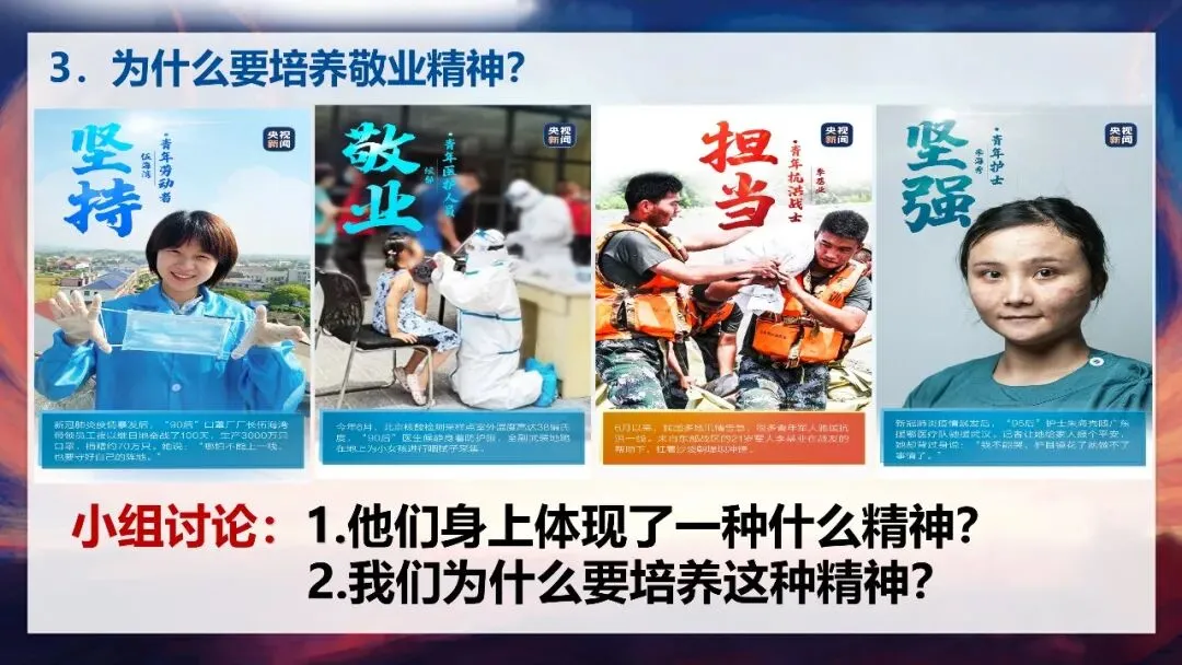 做好了职业准备,找到了合适的职业,还需要一种重要的品质,那就是敬业精神。我们先来看几个感人的故事(播放视频):新冠肺炎疫情暴发后,“90后”口罩厂厂长伍海湾带领员工夜以继日奋战100天,生产3000万只口罩,还捐赠了约70万只,她说“哪怕不能上一线,也要守好自己的阵地”;6月以来多地汛情告急,21岁的青年军人李基业驰援抗洪一线,在战友的帮助下,扛着沙袋朝堤坝冲锋;同样在疫情期间,“95后”护士朱海秀随广东援鄂医疗队驰援武汉,记者让她给家人报平安,她却背过身说“我不能哭,护目镜花了就做不了事情了”。