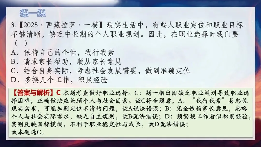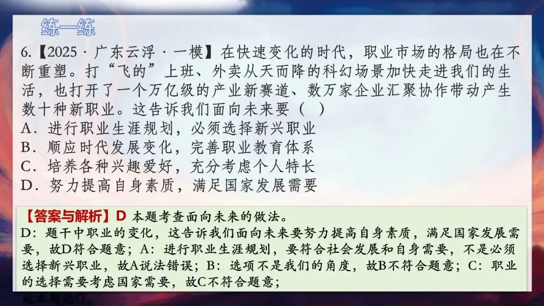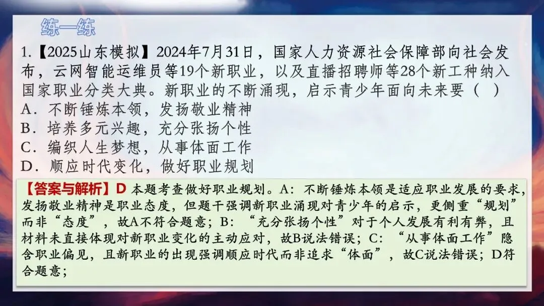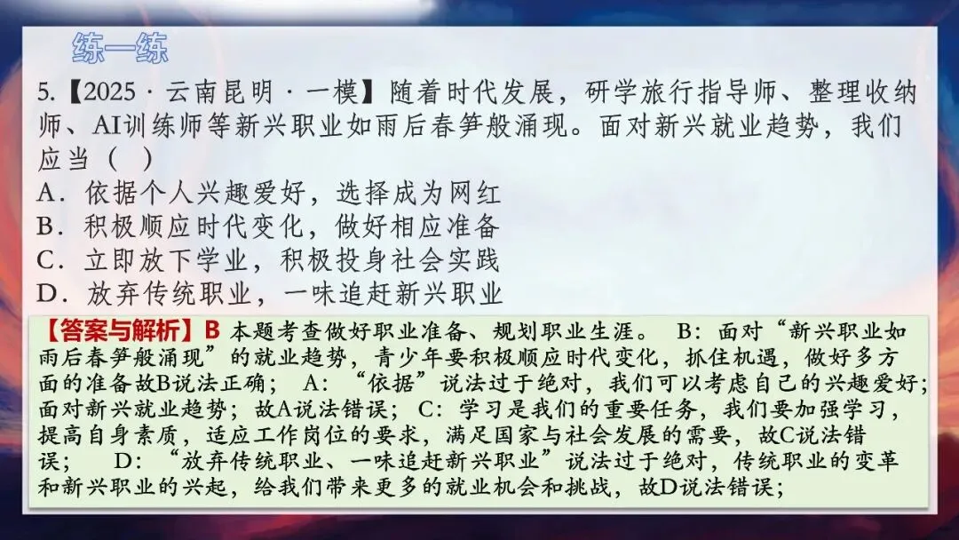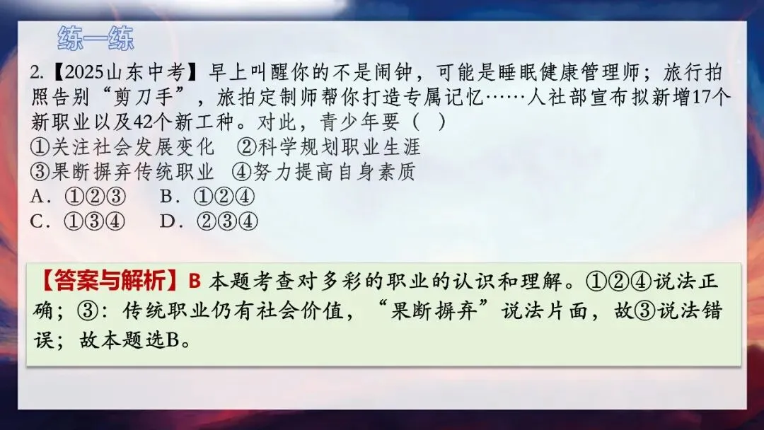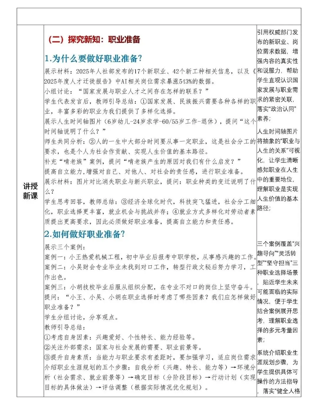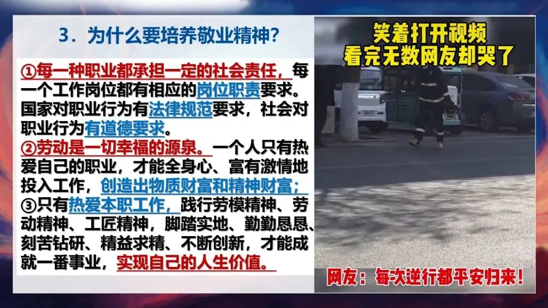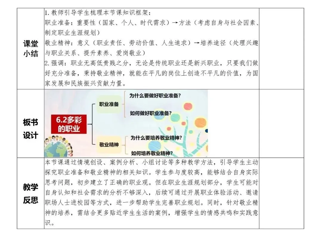 职业无高低贵贱之分,无论是传统职业还是新兴职业,只要我们做好充分准备,秉持敬业精神,脚踏实地、努力奋斗,就能在平凡的岗位上创造不平凡的价值,为国家发展和民族振兴贡献自己的力量。希望同学们能把今天学到的知识运用到实际生活中,从现在开始规划自己的未来,努力成为有理想、有本领、有担当的时代新人!