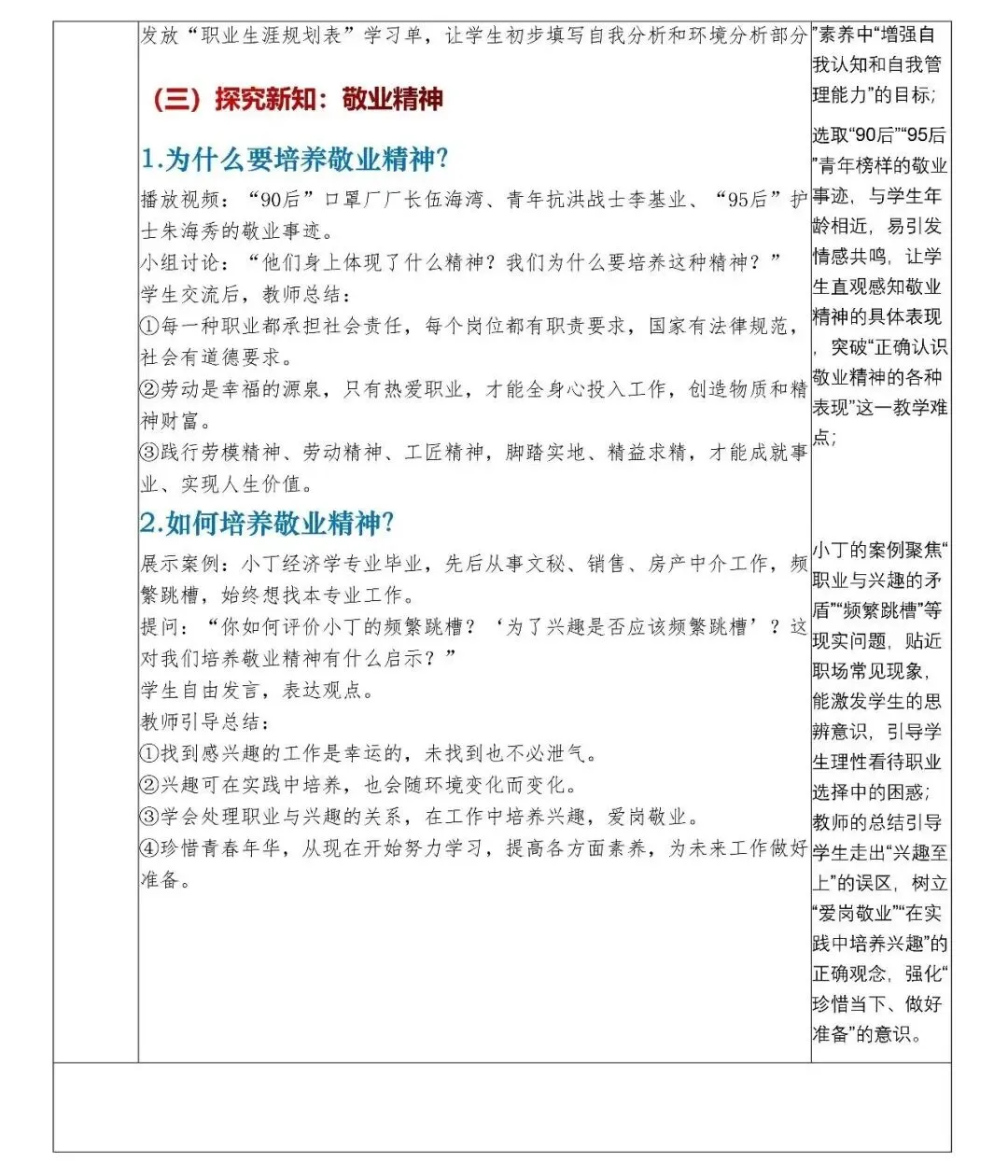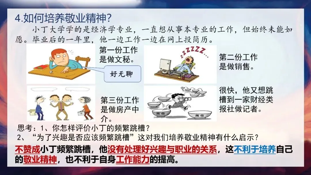 大家想一想:你怎样评价小丁的频繁跳槽?“为了兴趣是否应该频繁跳槽”?这对我们培养敬业精神有什么启示?(引导学生自由发言)有同学说小丁太浮躁了,也有同学说兴趣很重要但不能盲目跳槽。确实,能够找到一份自己感兴趣的工作是幸运的、快乐的,但如果没有找到也不必泄气。