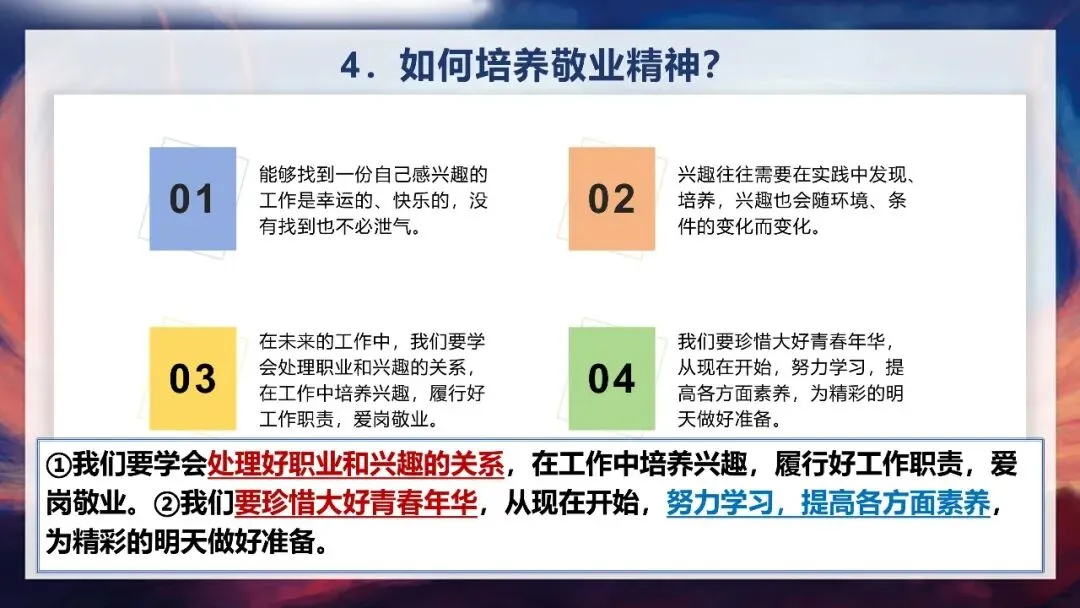 总结一下,培养敬业精神,一是要正确处理职业与兴趣的关系,在工作中培养兴趣、爱岗敬业;二是要珍惜当下,努力提升自身素养,为未来的职业发展打下坚实基础。